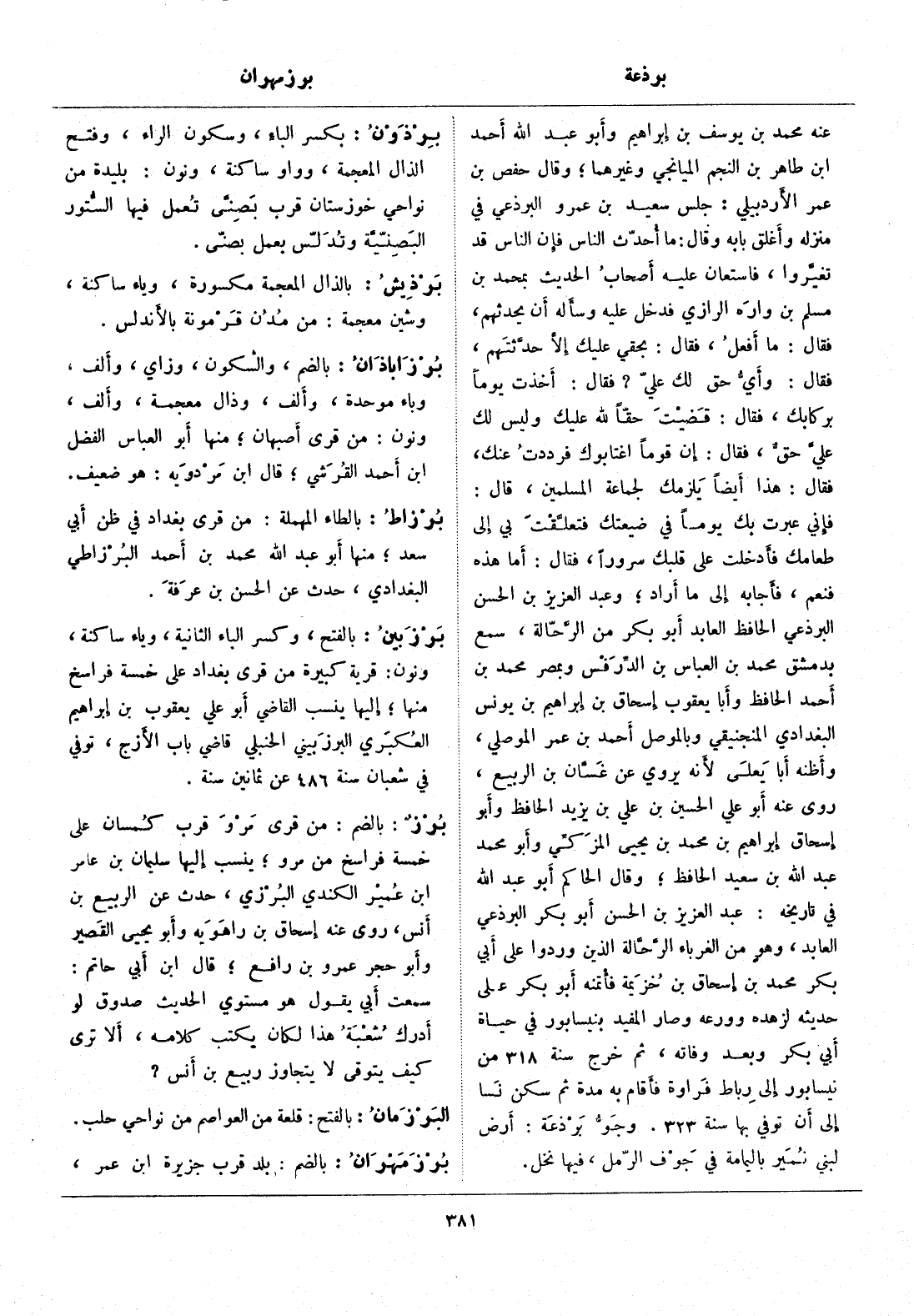 فإني عبرت بك يوما في ضيعتك فتعلّقت بي إلى طعامك فأدخلت على قلبك سرورا، فقال: أما هذه فنعم، فأجابه إلى ما أراد، وعبد العزيز بن الحسن البرذعي الحافظ العابد أبو بكر من الرّحّالة، سمع بدمشق محمد بن العباس بن الدّرفس وبمصر محمد بن أحمد الحافظ وأبا يعقوب إسحاق بن إبراهيم بن يونس البغدادي المنجنيقي وبالموصل أحمد بن عمر الموصلي، وأظنه أبا يعلى لأنه يروي عن غسّان بن الربيع، روى عنه أبو علي الحسين بن علي بن يزيد الحافظ وأبو إسحاق إبراهيم بن محمد بن يحيى المزكّي وأبو محمد عبد الله بن سعيد الحافظ، وقال الحاكم أبو عبد الله في تاريخه: عبد العزيز بن الحسن أبو بكر البرذعي العابد، وهو من الغرباء الرّحّالة الذين وردوا على أبي بكر محمد بن إسحاق بن خزيمة فائتمنه أبو بكر على حديثه لزهده وورعه وصار المفيد بنيسابور في حياة أبي بكر وبعد وفاته، ثم خرج سنة 318 من نيسابور إلى رباط فراوة فأقام به مدة ثم سكن نسا إلى أن توفي بها سنة 323. وجوّ برذعة: أرض لبني نمير باليمامة في جوف الرّمل، فيها نخل.