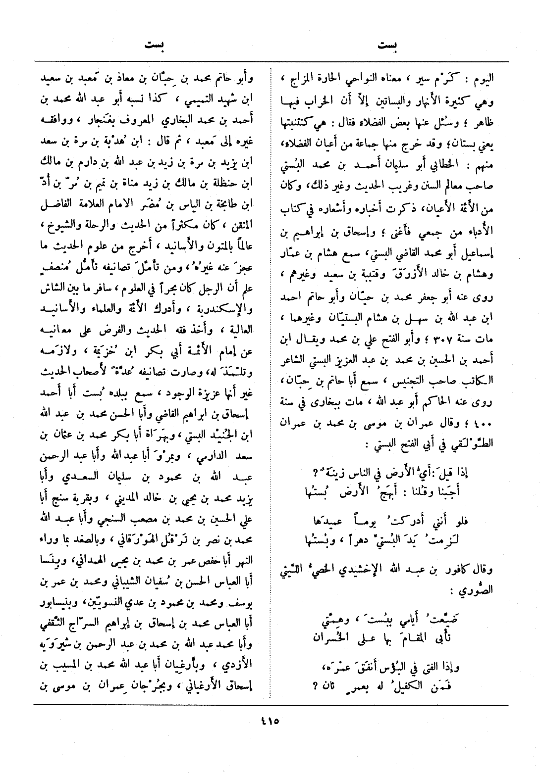 اليوم: كرم سير، معناه النواحي الحارة المزاج، وهي كثيرة الأنهار والبساتين إلّا أن الخراب فيها ظاهر، وسئل عنها بعض الفضلاء فقال: هي كتثنيتها يعني بستان، وقد خرج منها جماعة من أعيان الفضلاء، منهم: الخطابي أبو سليمان أحمد بن محمد البستي صاحب معالم السنن وغريب الحديث وغير ذلك، وكان من الأئمة الأعيان، ذكرت أخباره وأشعاره في كتاب الأدباء من جمعي فأغنى، وإسحاق بن إبراهيم بن إسماعيل أبو محمد القاضي البستي، سمع هشام بن عمّار وهشام بن خالد الأزرق وقتيبة بن سعيد وغيرهم، روى عنه أبو جعفر محمد بن حيّان وأبو حاتم احمد ابن عبد الله بن سهل بن هشام البستيّان وغيرهما، مات سنة 307، وأبو الفتح علي بن محمد ويقال ابن أحمد بن الحسين بن محمد بن عبد العزيز البستي الشاعر الكاتب صاحب التجنيس، سمع أبا حاتم بن حبّان، روى عنه الحاكم أبو عبد الله، مات ببخارى في سنة 400، وقال عمران بن موسى بن محمد بن عمران الطّولقي في أبي الفتح البستي: