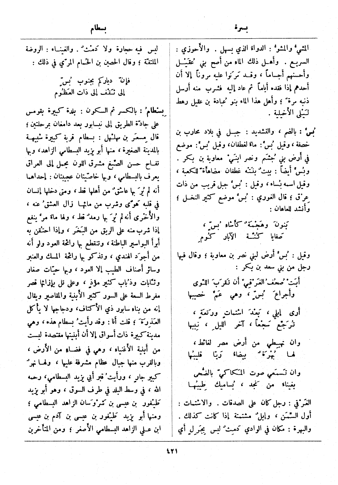 بالكسر ثم السكون: بلدة كبيرة بقومس على جادّة الطريق إلى نيسابور بعد دامغان بمرحلتين، قال مسعر بن مهلهل: بسطام قرية كبيرة شبيهة بالمدينة الصغيرة، منها أبو يزيد البسطامي الزاهد، وبها تفاح حسن الصّبغ مشرق اللون يحمل إلى العراق يعرف بالبسطامي، وبها خاصيّتان عجيبتان: إحداهما أنه لم ير بها عاشق من أهلها قط، ومتى دخلها إنسان في قلبه هوى وشرب من مائها زال العشق عنه، والأخرى أنه لم ير بها رمد قط، ولها ماء مرّ ينفع إذا شرب منه على الريق من البخر، وإذا احتقن به أبرأ البواسير الباطنة، وتنقطع بها رائحة العود ولو أنه من أجود الهندي، وتذكو بها رائحة المسك والعنبر وسائر أصناف الطيب إلا العود، وبها حيّات صغار وثّابات وذباب كثير مؤذ، وعلى تل بإزائها قصر مفرط السعة على السور كثير الأبنية والمقاصير ويقال إنه من بناء سابور ذي الأكتاف، ودجاجها لا يأكل العذرة، قلت أنا: وقد رأيت بسطام هذه، وهي مدينة كبيرة ذات أسواق إلا أن أبنيتها مقتصدة ليست من أبنية الأغنياء، وهي في فضاء من الأرض، وبالقرب منها جبال عظام مشرفة عليها، ولها نهر كبير جار، ورأيت قبر أبي يزيد البسطامي، رحمه الله، في وسط البلد في طرف السوق، وهو أبو يزيد طيفور بن عيسى بن شروسان الزاهد البسطامي، ومنها أبو يزيد طيفور بن عيسى بن آدم بن عيسى ابن علي الزاهد البسطامي الأصغر، ومن المتأخرين
