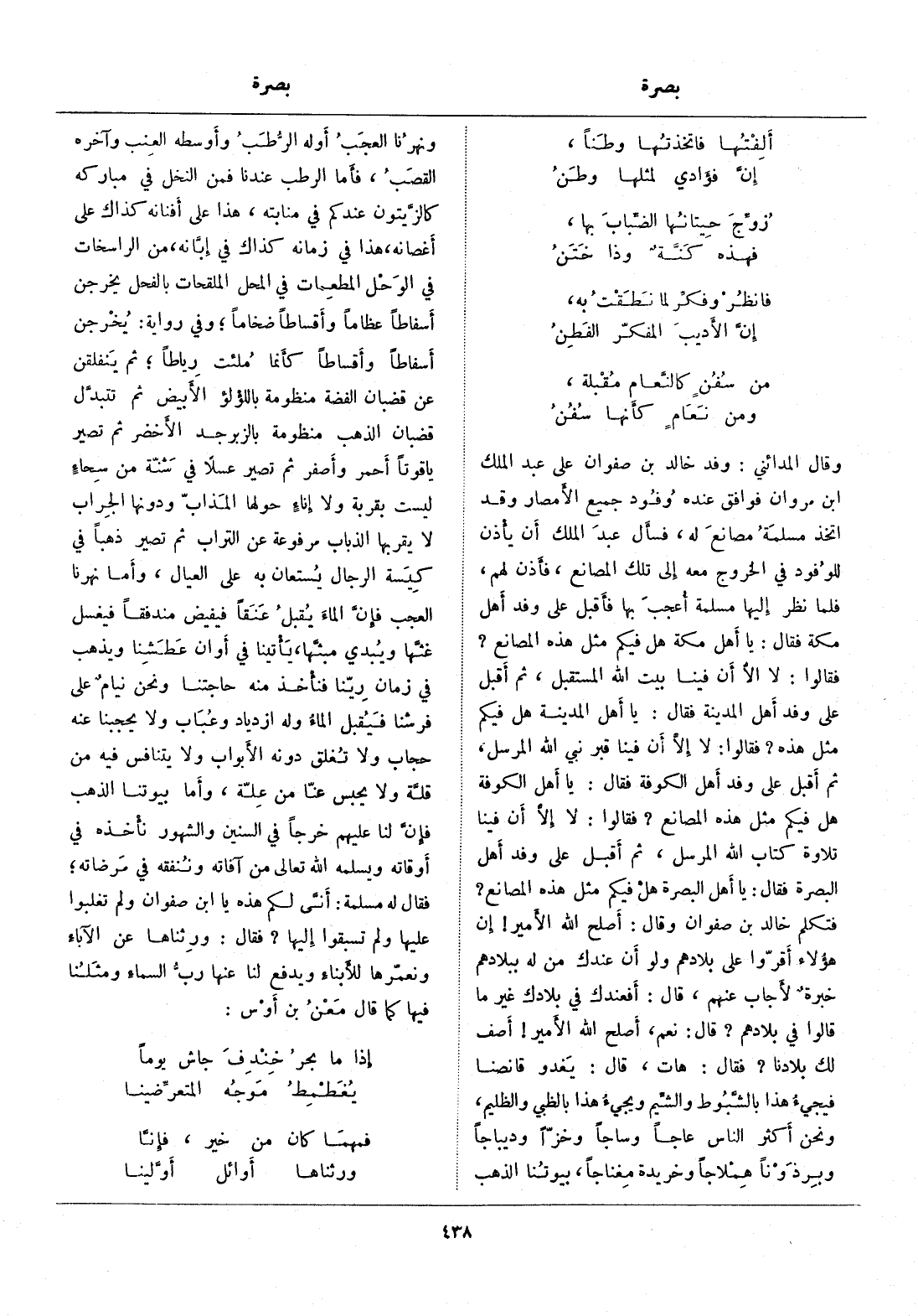 فتكلم خالد بن صفوان وقال: أصلح الله الأمير! إن هؤلاء أقرّوا على بلادهم ولو أن عندك من له ببلادهم خبرة لأجاب عنهم، قال: أفعندك في بلادك غير ما قالوا في بلادهم؟ قال: نعم، أصلح الله الأمير! أصف لك بلادنا؟ فقال: هات، قال: يغدو قانصانا فيجيء هذا بالشّبوط والشّيم ويجيء هذا بالظبي والظليم، ونحن أكثر الناس عاجا وساجا وخزّا وديباجا وبرذونا هملاجا وخريدة مغناجا، بيوتنا الذهب ونهرنا العجب أوله الرّطب وأوسطه العنب وآخره القصب، فأما الرطب عندنا فمن النخل في مباركه كالزّيتون عندكم في منابته، هذا على أفنانه كذاك على أغصانه، هذا في زمانه كذاك في إبّانه، من الراسخات في الوحل المطعمات في المحل الملقحات بالفحل يخرجن أسفاطا عظاما وأقساطا ضخاما، وفي رواية: يخرجن أسفاطا وأقساطا كأنما ملئت رياطا، ثم ينفلقن عن قضبان الفضة منظومة باللؤلؤ الأبيض ثم تتبدّل قضبان الذهب منظومة بالزبرجد الأخضر ثم تصير ياقوتا أحمر وأصفر ثم تصير عسلا في شنّة من سحاء ليست بقربة ولا إناء حولها المذابّ ودونها الجراب لا يقربها الذباب مرفوعة عن التراب ثم تصير ذهبا في كيسة الرجال يستعان به على العيال، وأما نهرنا العجب فإنّ الماء يقبل عنقا فيفيض مندفقا فيغسل غثّها ويبدي مبثّها، يأتينا في أوان عطشنا ويذهب في زمان ريّنا فنأخذ منه حاجتنا ونحن نيام على فرشنا فيقبل الماء وله ازدياد وعباب ولا يحجبنا عنه حجاب ولا تغلق دونه الأبواب ولا يتنافس فيه من قلّة ولا يحبس عنّا من علّة، وأما بيوتنا الذهب فإنّ لنا عليهم خرجا في السنين والشهور نأخذه في أوقاته ويسلمه الله تعالى من آفاته وننفقه في مرضاته، فقال له مسلمة: أنّى لكم هذه يا ابن صفوان ولم تغلبوا عليها ولم تسبقوا إليها؟ فقال: ورثناها عن الآباء ونعمّرها للأبناء ويدفع لنا عنها ربّ السماء ومثلنا فيها كما قال معن بن أوس: