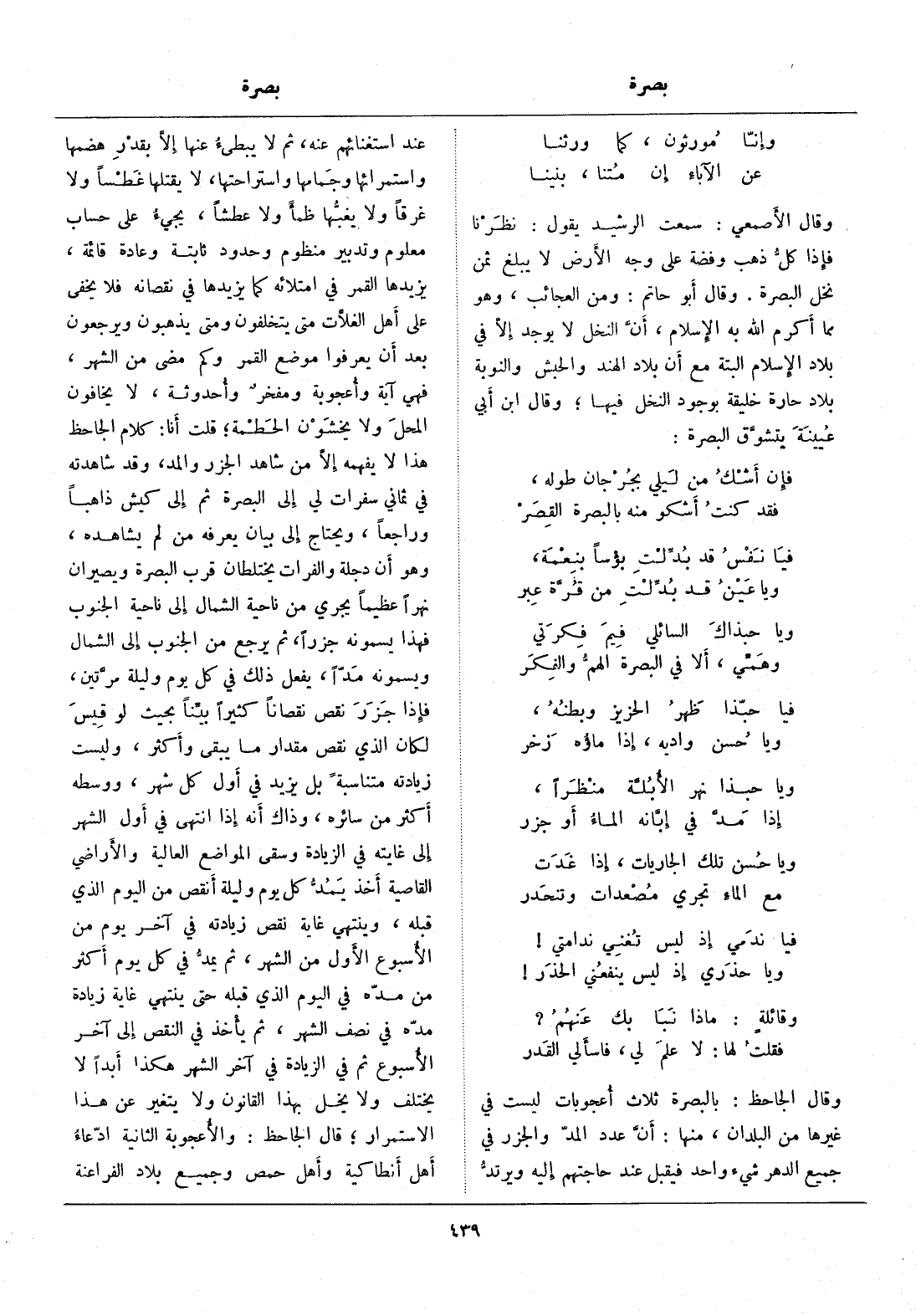وقال الجاحظ: بالبصرة ثلاث أعجوبات ليست في غيرها من البلدان، منها: أنّ عدد المدّ والجزر في جميع الدهر شيء واحد فيقبل عند حاجتهم إليه ويرتدّ عند استغنائهم عنه، ثم لا يبطئ عنها إلّا بقدر هضمها واستمرائها وجمامها واستراحتها، لا يقتلها غطسا ولا غرقا ولا يغبّها ظمأ ولا عطشا، يجيء على حساب معلوم وتدبير منظوم وحدود ثابتة وعادة قائمة، يزيدها القمر في امتلائه كما يزيدها في نقصانه فلا يخفى على أهل الغلّات متى يتخلفون ومتى يذهبون ويرجعون بعد أن يعرفوا موضع القمر وكم مضى من الشهر، فهي آية وأعجوبة ومفخر وأحدوثة، لا يخافون المحل ولا يخشون الحطمة، قلت أنا: كلام الجاحظ هذا لا يفهمه إلّا من شاهد الجزر والمد، وقد شاهدته في ثماني سفرات لي إلى البصرة ثم إلى كيش ذاهبا وراجعا، ويحتاج إلى بيان يعرفه من لم يشاهده، وهو أن دجلة والفرات يختلطان قرب البصرة ويصيران نهرا عظيما يجري من ناحية الشمال إلى ناحية الجنوب فهذا يسمونه جزرا، ثم يرجع من الجنوب إلى الشمال ويسمونه مدّا، يفعل ذلك في كل يوم وليلة مرّتين، فإذا جزر نقص نقصانا كثيرا بيّنا بحيث لو قيس لكان الذي نقص مقدار ما يبقى وأكثر، وليست زيادته متناسبة بل يزيد في أول كل شهر، ووسطه أكثر من سائره، وذاك أنه إذا انتهى في أول الشهر إلى غايته في الزيادة وسقى المواضع العالية والأراضي القاصية أخذ يمدّ كل يوم وليلة أنقص من اليوم الذي قبله، وينتهي غاية نقص زيادته في آخر يوم من الأسبوع الأول من الشهر، ثم يمدّ في كل يوم أكثر من مدّه في اليوم الذي قبله حتى ينتهي غاية زيادة مدّه في نصف الشهر، ثم يأخذ في النقص إلى آخر الأسبوع ثم في الزيادة في آخر الشهر هكذا أبدا لا يختلف ولا يخل بهذا القانون ولا يتغير عن هذا الاستمرار، قال الجاحظ: والأعجوبة الثانية ادّعاء أهل أنطاكية وأهل حمص وجميع بلاد الفراعنة