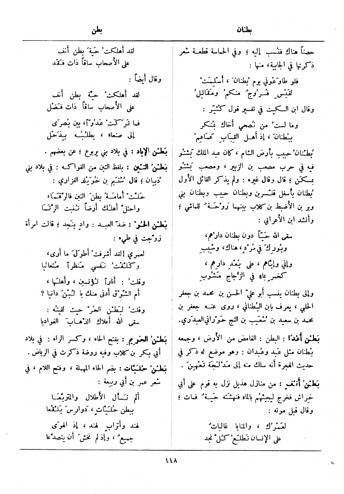 البطن: الغامض من الأرض، وجمعه بطنان مثل عبد وعبدان: وهو موضع له ذكر في حديث الهجرة أنه سلك منه إلى مدلجة تعهن.