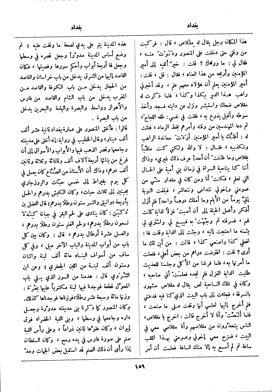 افعلي كذا واصنعي كذا، قالت: من أين لك ما أرى؟ قلت: اقترضت دراهم من بعض أهلي، ففعلت ما أمرتها به، فلما فرغنا من الأكل وجلسنا للحديث طلبت الداية الغزل فلم تجده فعلمت أني صاحبه، وكان في تلك الناحية لص يقال له مقلاص مشهور بالسرقة، فجاءت إلى باب البيت الذي كنا فيه فدعتني فلم أخرج إليها لعلمي أنها وقفت على ما صنعت، فلما ألحّت وأنا لا أخرج قالت: اخرج يا مقلاص، الناس يتحذّرون من مقلاصهم وأنا مقلاصي معي في البيت، فمزح معي إخوتي وعمومتي بهذا اللقب ساعة ثم لم أسمع به إلا منك الساعة فعلمت أن أمر هذه المدينة يتم على يدي لصحة ما وقفت عليه، ثم وضع أساس المدينة مدوّرا وجعل قصره في وسطها وجعل لها أربعة أبواب وأحكم سورها وفصيلها، فكان القاصد إليها من الشرق يدخل من باب خراسان والقاصد من الحجاز يدخل من باب الكوفة والقاصد من المغرب يدخل من باب الشام والقاصد من فارس والأهواز وواسط والبصرة واليمامة والبحرين يدخل من باب البصرة.