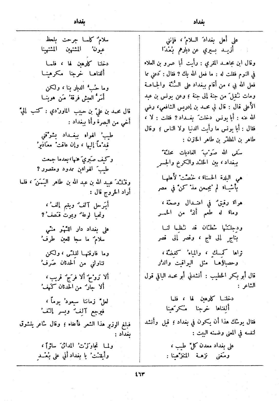 وقال ابن مجاهد المقري: رأيت أبا عمرو بن العلاء في النوم فقلت له: ما فعل الله بك؟ فقال: دعني مما فعل الله بي، من أقام ببغداد على السّنّة والجماعة ومات نقل من جنة إلى جنة، وعن يونس بن عبد الأعلى قال: قال لي محمد بن إدريس الشافعي، رضي الله عنه: أيا يونس دخلت بغداد؟ فقلت: لا، فقال: أيا يونس ما رأيت الدنيا ولا الناس، وقال طاهر بن المظفّر بن طاهر الخازن: