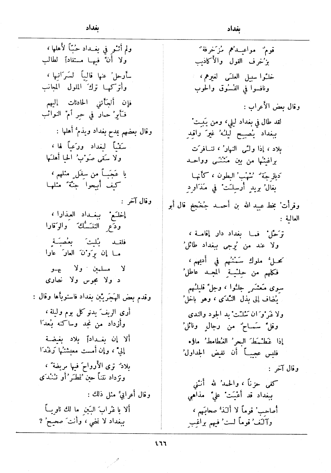 ولم أثو في بغداد حبّا لأهلها، ... ولا أنّ فيها مستفادا لطالب