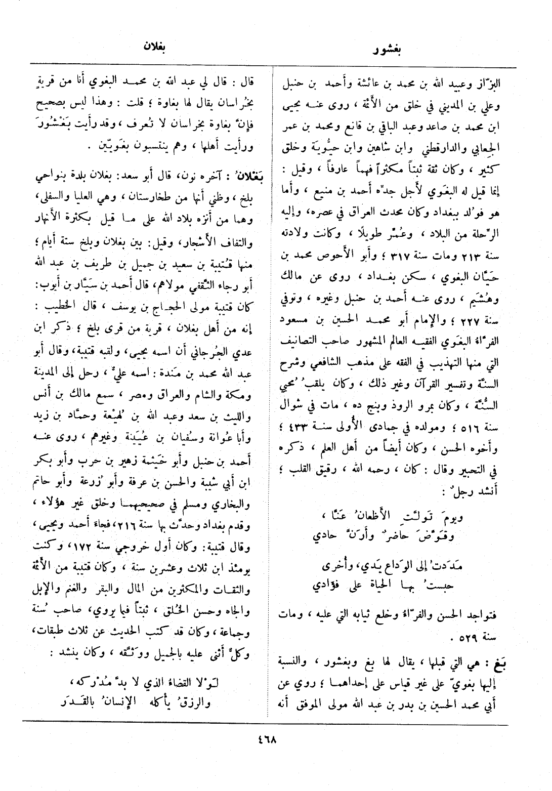 إنما قيل له البغوي لأجل جدّه أحمد بن منيع، وأما هو فولد ببغداد وكان محدث العراق في عصره، وإليه الرّحلة من البلاد، وعمّر طويلا، وكانت ولادته سنة 213 ومات سنة 317، وأبو الأحوص محمد بن حيّان البغوي، سكن بغداد، روى عن مالك وهشيم، روى عنه أحمد بن حنبل وغيره، وتوفي سنة 227، والإمام أبو محمد الحسين بن مسعود الفرّاء البغوي الفقيه العالم المشهور صاحب التصانيف التي منها التهذيب في الفقه على مذهب الشافعي وشرح السنّة وتفسير القرآن وغير ذلك، وكان يلقب محيى السّنّة، وكان بمرو الروذ وبنج ده، مات في شوال سنة 516، ومولده في جمادى الأولى سنة 433، وأخوه الحسن، وكان أيضا من أهل العلم، ذكره في التحبير وقال: كان، رحمه الله، رقيق القلب، أنشد رجل: