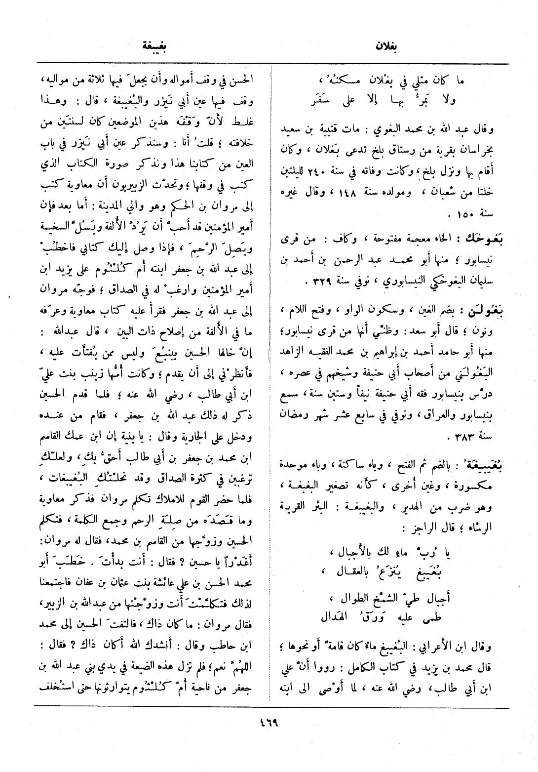 وقال ابن الأعرابي: البغيبغ ماء كان قامة أو نحوها، قال محمد بن يزيد في كتاب الكامل: رووا أنّ علي ابن أبي طالب، رضي الله عنه، لما أوصى الى ابنه الحسن في وقف أمواله وأن يجعل فيها ثلاثة من مواليه، وقف فيها عين أبي نيزر والبغيبغة، قال: وهذا غلط لأنّ وقفه هذين الموضعين كان لسنتين من خلافته، قلت أنا: وسنذكر عين أبي نيزر في باب العين من كتابنا هذا ونذكر صورة الكتاب الذي كتب في وقفها، وتحدّث الزبيريون أن معاوية كتب إلى مروان بن الحكم وهو والي المدينة: أما بعد فإن أمير المؤمنين قد أحبّ أن يردّ الألفة ويسلّ السخيمة ويصل الرّحم، فإذا وصل إليك كتابي فاخطب إلى عبد الله بن جعفر ابنته أم كلثوم على يزيد ابن أمير المؤمنين وارغب له في الصداق، فوجّه مروان إلى عبد الله بن جعفر فقرأ عليه كتاب معاوية وعرّفه ما في الألفة من إصلاح ذات البين، قال عبد الله: