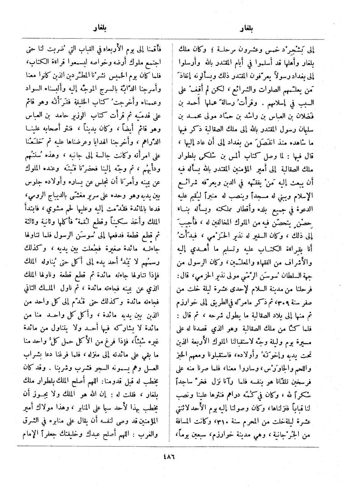 فلما كنّا من ملك الصقالبة وهو الذي قصدنا له على مسيرة يوم وليلة وجّه لاستقبالنا الملوك الأربعة الذين تحت يديه وإخوته وأولاده، فاستقبلونا ومعهم الخبز واللحم والجاورس، وساروا معنا، فلما صرنا منه على فرسخين تلقّانا هو بنفسه فلما رآنا نزل فخرّ ساجدا شكرا لله، وكان في كمّه دراهم فنثرها علينا ونصب لنا قبابا فنزلناها، وكان وصولنا إليه يوم الأحد لاثنتي عشرة ليلة خلت من المحرم سنة 310، وكانت المسافة من الجرجانية، وهي مدينة خوارزم، سبعين يوما، فأقمنا إلى يوم الأربعاء في القباب التي ضربت لنا حتى اجتمع ملوك أرضه وخواصه ليسمعوا قراءة الكتاب، فلما كان يوم الخميس نشرنا المطرّدين الذين كانوا معنا وأسرجنا الدّابّة بالسرج الموجّه إليه وألبسناه السواد وعممناه وأخرجت كتاب الخليفة فقرأته وهو قائم على قدميه ثم قرأت كتاب الوزير حامد بن العباس وهو قائم أيضا، وكان بدينا، فنثر أصحابه علينا الدّراهم، وأخرجنا الهدايا وعرضناها عليه ثم خلعنا على امرأته وكانت جالسة إلى جانبه، وهذه سنتهم ودأبهم، ثم وجّه إلينا فحضرنا قبته وعنده الملوك عن يمينه وأمرنا أن نجلس عن يساره وأولاده جلوس بين يديه وهو وحده على سرير مغشّى بالديباج الرومي، فدعا بالمائدة فقدّمت إليه وعليها لحم مشوي، فابتدأ الملك وأخذ سكينا وقطع لقمة فأكلها وثانية وثالثة ثم قطع قطعة فدفعها إلى سوسن الرسول فلما تناولها جاءته مائدة صغيرة فجعلت بين يديه، وكذلك رسمهم لا يمدّ أحد يده إلى أكل حتى يناوله الملك فإذا تناولها جاءته مائدة ثم قطع قطعة وناولها الملك الذي عن يمينه فجاءته مائدة، ثم ناول الملك الثاني فجاءته مائدة وكذلك حتى قدّم إلى كل واحد من الذين بين يديه مائدة، وأكل كل واحد منا من مائدة لا يشاركه فيها أحد ولا يتناول من مائدة غيره شيئا، فإذا فرغ من الأكل حمل كلّ واحد منا ما بقي على مائدته إلى منزله، فلما فرغنا دعا بشراب العسل وهم يسمونه السجو فشرب وشربنا. وقد كان يخطب له قبل قدومنا: اللهم أصلح الملك بلطوار ملك بلغار، فقلت له: إن الله هو الملك ولا يجوز أن يخطب بهذا لأحد سيما على المنابر، وهذا مولاك أمير المؤمنين قد وصى لنفسه أن يقال على منابره في الشرق والغرب: اللهم أصلح عبدك وخليفتك جعفرا الإمام