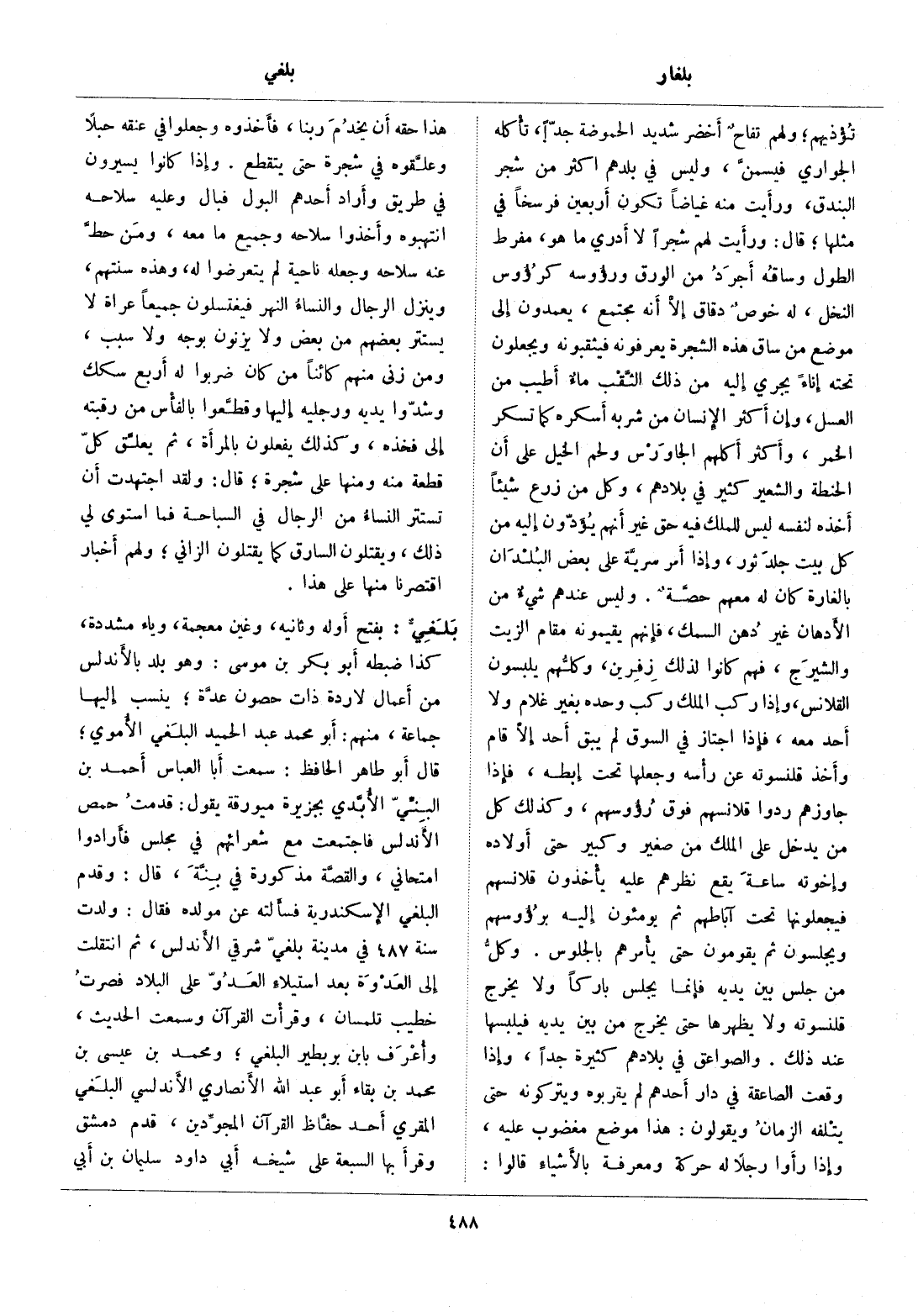 تؤذيهم، ولهم تفاح أخضر شديد الحموضة جدّا، تأكله الجواري فيسمّن، وليس في بلدهم اكثر من شجر البندق، ورأيت منه غياضا تكون أربعين فرسخا في مثلها، قال: ورأيت لهم شجرا لا أدري ما هو، مفرط الطول وساقه أجرد من الورق ورؤوسه كرءوس النخل، له خوص دقاق إلّا أنه مجتمع، يعمدون إلى موضع من ساق هذه الشجرة يعرفونه فيثقبونه ويجعلون تحته إناء يجري إليه من ذلك الثّقب ماء أطيب من العسل، وإن أكثر الإنسان من شربه أسكره كما تسكر الخمر، وأكثر أكلهم الجاورس ولحم الخيل على أن الحنطة والشعير كثير في بلادهم، وكل من زرع شيئا أخذه لنفسه ليس للملك فيه حق غير أنهم يؤدّون إليه من كل بيت جلد ثور، وإذا أمر سريّة على بعض البلدان بالغارة كان له معهم حصّة. وليس عندهم شيء من الأدهان غير دهن السمك، فإنهم يقيمونه مقام الزيت والشيرج، فهم كانوا لذلك زفرين، وكلّهم يلبسون القلانس، وإذا ركب الملك ركب وحده بغير غلام ولا أحد معه، فإذا اجتاز في السوق لم يبق أحد إلّا قام وأخذ قلنسوته عن رأسه وجعلها تحت إبطه، فإذا جاوزهم ردوا قلانسهم فوق رؤوسهم، وكذلك كل من يدخل على الملك من صغير وكبير حتى أولاده وإخوته ساعة يقع نظرهم عليه يأخذون قلانسهم فيجعلونها تحت آباطهم ثم يومئون إليه برؤوسهم ويجلسون ثم يقومون حتى يأمرهم بالجلوس. وكلّ من جلس بين يديه فإنما يجلس باركا ولا يخرج قلنسوته ولا يظهرها حتى يخرج من بين يديه فيلبسها عند ذلك. والصواعق في بلادهم كثيرة جدا، وإذا وقعت الصاعقة في دار أحدهم لم يقربوه ويتركونه حتى يتلفه الزمان ويقولون: هذا موضع مغضوب عليه، وإذا رأوا رجلا له حركة ومعرفة بالأشياء قالوا: هذا حقه أن يخدم ربنا، فأخذوه وجعلوا في عنقه حبلا وعلّقوه في شجرة حتى يتقطع. وإذا كانوا يسيرون في طريق وأراد أحدهم البول فبال وعليه سلاحه انتهبوه وأخذوا سلاحه وجميع ما معه، ومن حطّ عنه سلاحه وجعله ناحية لم يتعرضوا له، وهذه سنتهم، وينزل الرجال والنساء النهر فيغتسلون جميعا عراة لا يستتر بعضهم من بعض ولا يزنون بوجه ولا سبب، ومن زنى منهم كائنا من كان ضربوا له أربع سكك وشدّوا يديه ورجليه إليها وقطّعوا بالفأس من رقبته إلى فخذه، وكذلك يفعلون بالمرأة، ثم يعلّق كلّ قطعة منه ومنها على شجرة، قال: ولقد اجتهدت أن تستتر النساء من الرجال في السباحة فما استوى لي ذلك، ويقتلون السارق كما يقتلون الزاني، ولهم أخبار اقتصرنا منها على هذا.