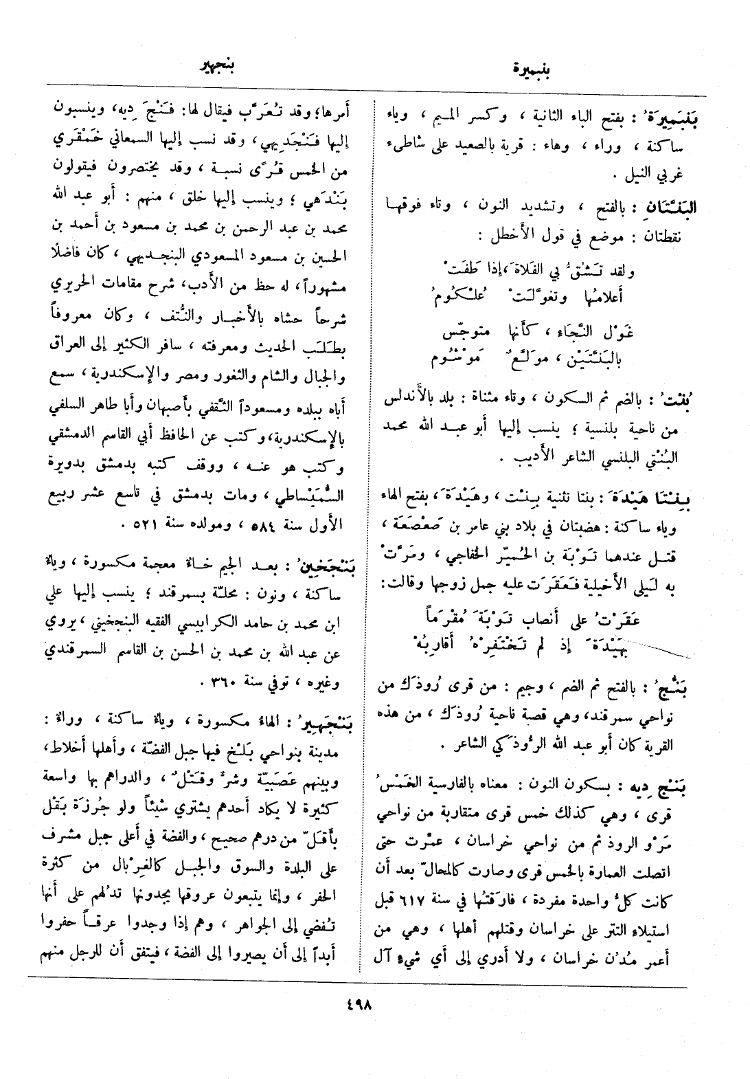 بسكون النون: معناه بالفارسية الخمس قرى، وهي كذلك خمس قرى متقاربة من نواحي مرو الروذ ثم من نواحي خراسان، عمّرت حتى اتصلت العمارة بالخمس قرى وصارت كالمحالّ بعد أن كانت كلّ واحدة مفردة، فارقتها في سنة 617 قبل استيلاء التتر على خراسان وقتلهم أهلها، وهي من أعمر مدن خراسان، ولا أدري إلى أي شيء آل أمرها، وقد تعرّب فيقال لها: فنج ديه، وينسبون إليها فنجديهي، وقد نسب إليها السمعاني خمقري من الخمس قرى نسبة، وقد يختصرون فيقولون بندهي، وينسب إليها خلق، منهم: أبو عبد الله محمد بن عبد الرحمن بن محمد بن مسعود بن أحمد بن الحسين بن مسعود المسعودي البنجديهي، كان فاضلا مشهورا، له حظ من الأدب، شرح مقامات الحريري شرحا حشاه بالأخبار والنّتف، وكان معروفا بطلب الحديث ومعرفته، سافر الكثير إلى العراق والجبال والشام والثغور ومصر والإسكندرية، سمع أباه ببلده ومسعودا الثّقفي بأصبهان وأبا طاهر السلفي بالإسكندرية، وكتب عن الحافظ أبي القاسم الدمشقي وكتب هو عنه، ووقف كتبه بدمشق بدويرة السّميساطي، ومات بدمشق في تاسع عشر ربيع الأول سنة 584، ومولده سنة 521.