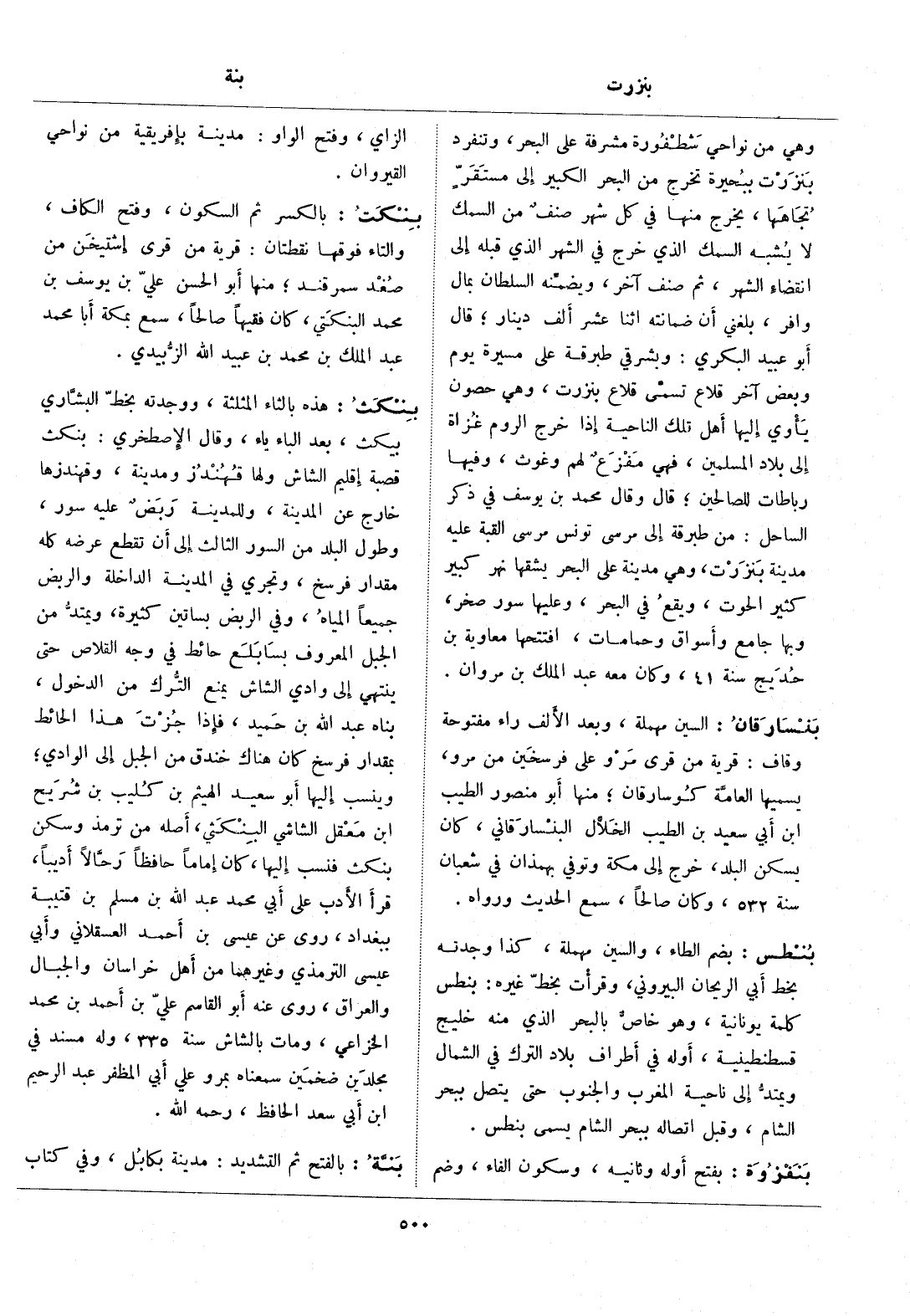 وهي من نواحي شطفورة مشرفة على البحر، وتنفرد بنزرت ببحيرة تخرج من البحر الكبير إلى مستقرّ تجاهها، يخرج منها في كل شهر صنف من السمك لا يشبه السمك الذي خرج في الشهر الذي قبله إلى انقضاء الشهر، ثم صنف آخر، ويضمنّه السلطان بمال وافر، بلغني أن ضمانته اثنا عشر ألف دينار، قال أبو عبيد البكري: وبشرقي طبرقة على مسيرة يوم وبعض آخر قلاع تسمّى قلاع بنزرت، وهي حصون يأوي إليها أهل تلك الناحية إذا خرج الروم غزاة إلى بلاد المسلمين، فهي مفزع لهم وغوث، وفيها رباطات للصالحين، قال وقال محمد بن يوسف في ذكر الساحل: من طبرقة إلى مرسى تونس مرسى القبة عليه مدينة بنزرت، وهي مدينة على البحر يشقها نهر كبير كثير الحوت، ويقع في البحر، وعليها سور صخر، وبها جامع وأسواق وحمامات، افتتحها معاوية بن حديج سنة 41، وكان معه عبد الملك بن مروان.