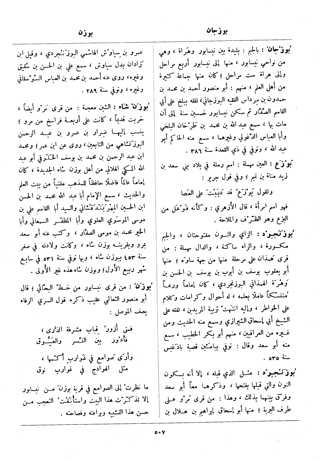بالجيم: بليدة بين نيسابور وهراة، وهي من نواحي نيسابور، منها إلى نيسابور أربع مراحل وإلى هراة ست مراحل، كان منها جماعة كثيرة من أهل العلم، منهم: أبو منصور أحمد بن محمد بن حمدون بن مرداس الفقيه البوزجاني، تفقه ببلخ على أبي القاسم الصّفّار ثم سكن نيسابور خمسين سنة إلى أن مات بها، سمع عبد الله بن محمد بن طرخان البلخي وأبا العباس الدّغولي وغيرهما، سمع منه الحاكم أبو عبد الله، وتوفي في ذي القعدة سنة 386.