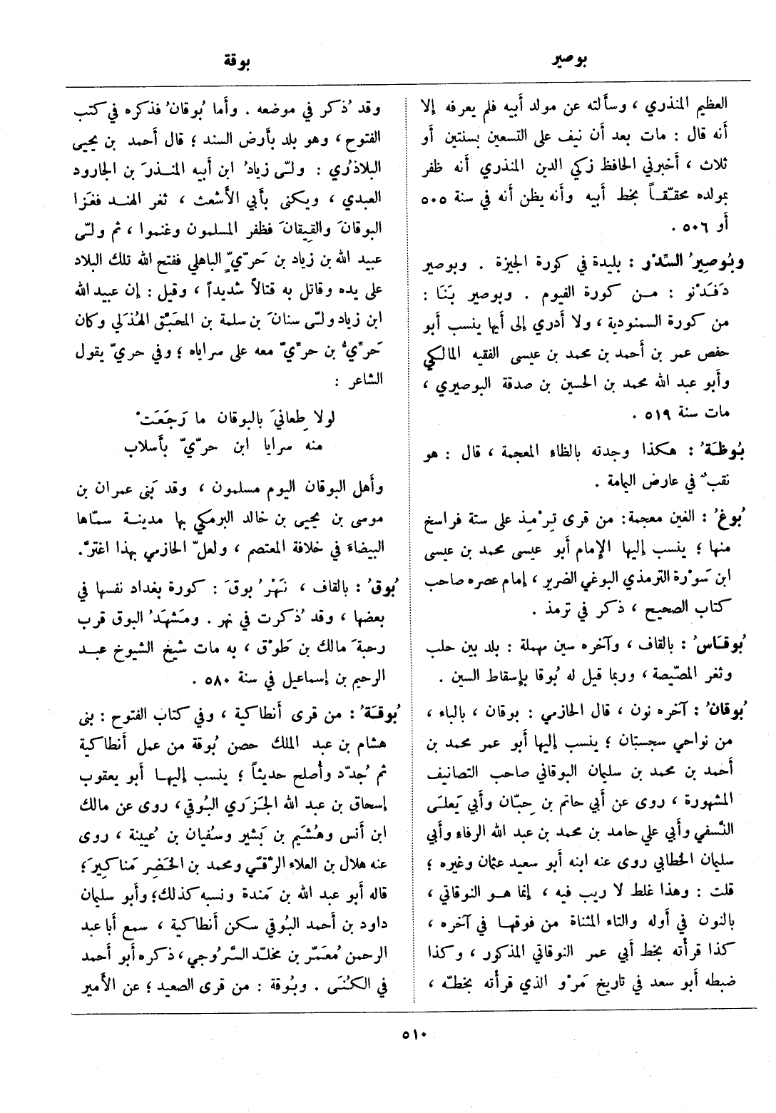 آخره نون، قال الحازمي: بوقان، بالباء، من نواحي سجستان، ينسب إليها أبو عمر محمد بن أحمد بن محمد بن سليمان البوقاني صاحب التصانيف المشهورة، روى عن أبي حاتم بن حبّان وأبي يعلى النّسفي وأبي علي حامد بن محمد بن عبد الله الرفاء وأبي سليمان الخطابي روى عنه ابنه أبو سعيد عثمان وغيره، قلت: وهذا غلط لا ريب فيه، إنما هو النوقاتي، بالنون في أوله والتاء المثناة من فوقها في آخره، كذا قرأته بخط أبي عمر النوقاتي المذكور، وكذا ضبطه أبو سعد في تاريخ مرو الذي قرأته بخطّه، وقد ذكر في موضعه. وأما بوقان فذكره في كتب الفتوح، وهو بلد بأرض السند، قال أحمد بن يحيى البلاذري: ولّى زياد ابن أبيه المنذر بن الجارود العبدي، ويكنى بأبي الأشعث، ثغر الهند فغزا البوقان والقيقان فظفر المسلمون وغنموا، ثم ولّى عبيد الله بن زياد بن حرّيّ الباهلي ففتح الله تلك البلاد على يده وقاتل به قتالا شديدا، وقيل: إن عبيد الله ابن زياد ولّى سنان بن سلمة بن المحبّق الهذلي وكان حرّيّ بن حرّيّ معه على سراياه، وفي حريّ يقول الشاعر: