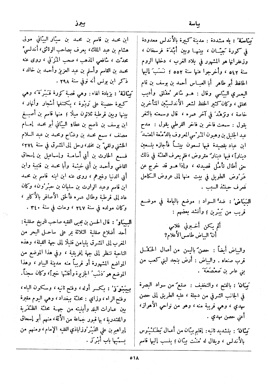 ياء مشددة: مدينة كبيرة بالأندلس معدودة في كورة جيّان، بينها وبين أبّدة فرسخان، وزعفرانها هو المشهور في بلاد الغرب، دخلها الروم سنة 542، وأخرجوا عنها سنة 552، نسب إليها الحافظ أبو طاهر أبا العباس أحمد بن يوسف بن تمام اليعمري البيّاسي وقال: هو شاعر مفلق وأديب محقق، وكان كثير الحفظ لشعر الأندلسيّين المتأخرين خاصة، وتزهّد في آخر عمره، قال وسمعته بالثغر يقول: سمعت فاخر بن فاخر القرطبي يقول: مدح عبد الجليل بن وهبون المرسي المعروف بالدّمعة المعتمد ابن عباد بقصيدة فيها تسعون بيتا فأجازه بتسعين دينارا، فيها دينار مقروض، فلم يعرف العلّة في ذلك حتى أطال تأمّل قصيدته، وإذا هو قد خرج عن عروض الطويل في بيت منها إلى عروض الكامل فعرف حينئذ السبب.