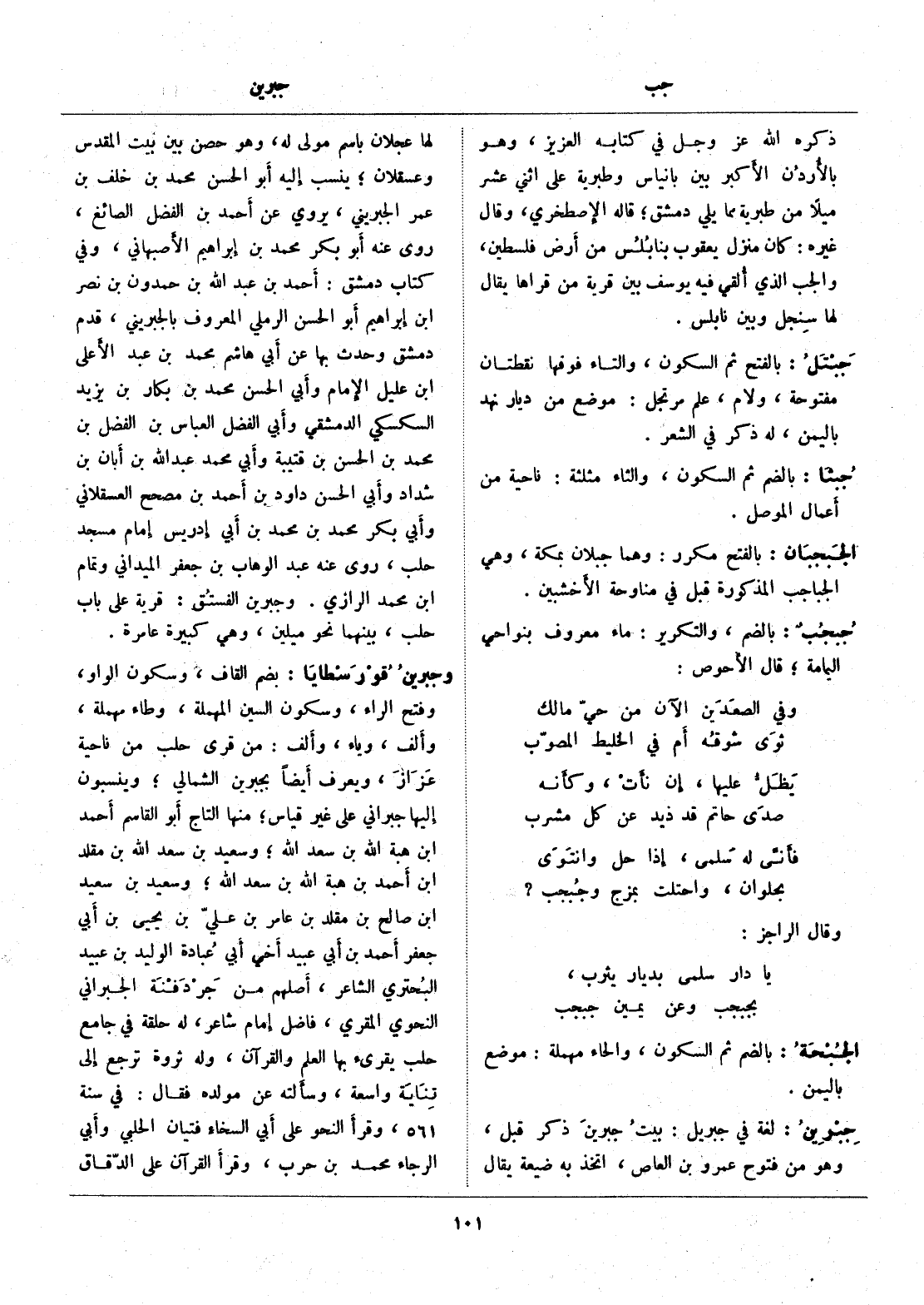 لغة في جبريل: بيت جبرين ذكر قبل، وهو من فتوح عمرو بن العاص، اتخذ به ضيعة يقال لها عجلان باسم مولى له، وهو حصن بين بيت المقدس وعسقلان ينسب إليه أبو الحسن محمد بن خلف بن عمر الجبريني، يروي عن أحمد بن الفضل الصائغ، روى عنه أبو بكر محمد بن إبراهيم الأصبهاني، وفي كتاب دمشق: أحمد بن عبد الله بن حمدون بن نصر ابن إبراهيم أبو الحسن الرملي المعروف بالجبريني، قدم دمشق وحدث بها عن أبي هاشم محمد بن عبد الأعلى ابن عليل الإمام وأبي الحسن محمد بن بكار بن يزيد السكسكي الدمشقي وأبي الفضل العباس بن الفضل بن محمد بن الحسن بن قتيبة وأبي محمد عبد الله بن أبان بن شداد وأبي الحسن داود بن أحمد بن مصحح العسقلاني وأبي بكر محمد بن محمد بن أبي إدريس إمام مسجد حلب، روى عنه عبد الوهاب بن جعفر الميداني وتمام ابن محمد الرازي. وجبرين الفستق: قرية على باب حلب، بينهما نحو ميلين، وهي كبيرة عامرة.