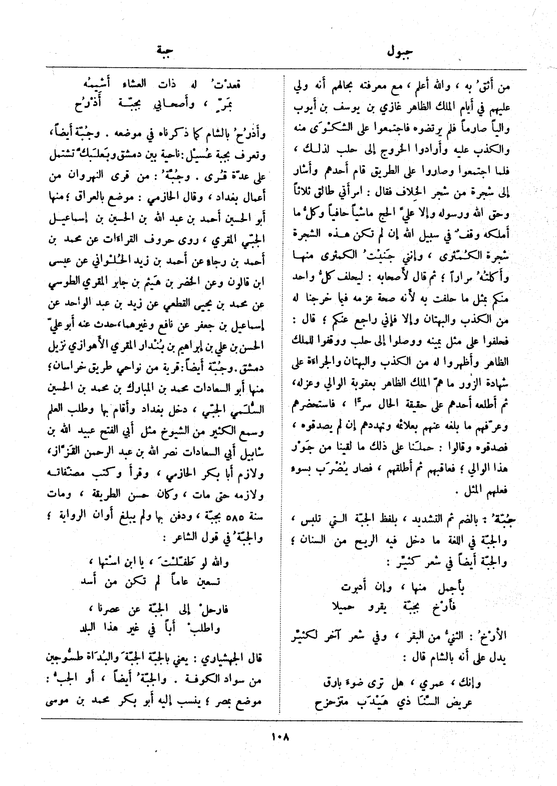 وأذرح بالشام كما ذكرناه في موضعه. وجبّة أيضا، وتعرف بجبة عسيل: ناحية بين دمشق وبعلبك تشتمل على عدّة قرى. وجبّة: من قرى النهروان من أعمال بغداد، وقال الحازمي: موضع بالعراق منها أبو الحسين أحمد بن عبد الله بن الحسين بن إسماعيل الجبّي المقري، روى حروف القراءات عن محمد بن أحمد بن رجاء عن أحمد بن زيد الحلواني عن عيسى ابن قالون وعن الخضر بن هيثم بن جابر المقري الطوسي عن محمد بن يحيى القطعي عن زيد بن عبد الواحد عن إسماعيل بن جعفر عن نافع وغيرهما، حدث عنه أبو عليّ الحسن بن علي بن إبراهيم بن بندار المقري الأهوازي نزيل دمشق. وجبّة أيضا: قرية من نواحي طريق خراسان منها أبو السعادات محمد بن المبارك بن محمد بن الحسين السّلمي الجبّي، دخل بغداد وأقام بها وطلب العلم وسمع الكثير من الشيوخ مثل أبي الفتح عبيد الله بن شابيل أبي السعادات نصر الله بن عبد الرحمن القزّاز، ولازم أبا بكر الحازمي، وقرأ وكتب مصنّفاته ولازمه حتى مات، وكان حسن الطريقة، ومات سنة 585 بجبّة، ودفن بها ولم يبلغ أوان الرواية والجبّة في قول الشاعر: