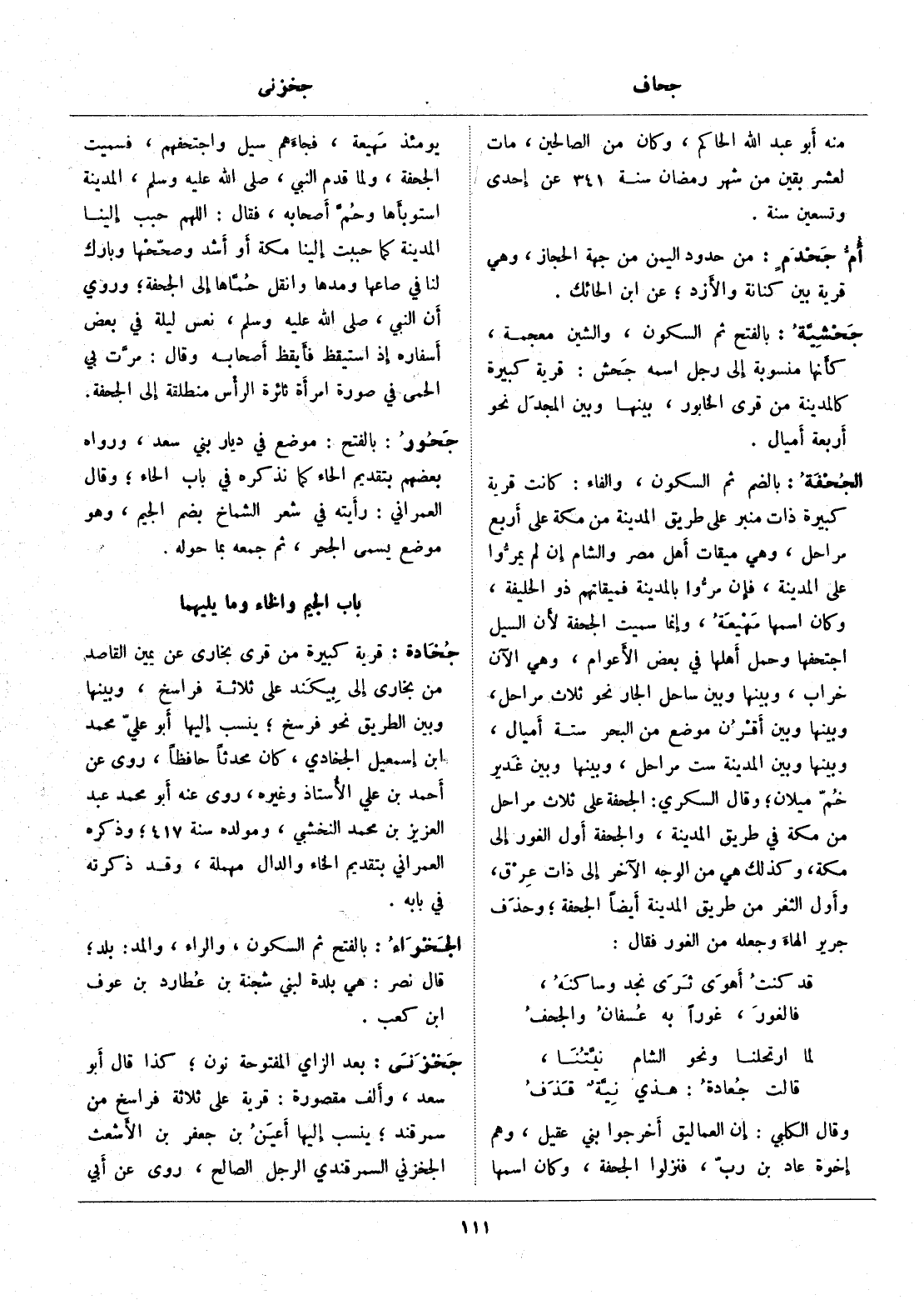 بالضم ثم السكون، والفاء: كانت قرية كبيرة ذات منبر على طريق المدينة من مكة على أربع مراحل، وهي ميقات أهل مصر والشام إن لم يمرّوا على المدينة، فإن مرّوا بالمدينة فميقاتهم ذو الحليفة، وكان اسمها مهيعة، وإنما سميت الجحفة لأن السيل اجتحفها وحمل أهلها في بعض الأعوام، وهي الآن خراب، وبينها وبين ساحل الجار نحو ثلاث مراحل، وبينها وبين أقرن موضع من البحر ستة أميال، وبينها وبين المدينة ست مراحل، وبينها وبين غدير خمّ ميلان، وقال السكري: الجحفة على ثلاث مراحل من مكة في طريق المدينة، والجحفة أول الغور إلى مكة، وكذلك هي من الوجه الآخر إلى ذات عرق، وأول الثغر من طريق المدينة أيضا الجحفة، وحذف جرير الهاء وجعله من الغور فقال: