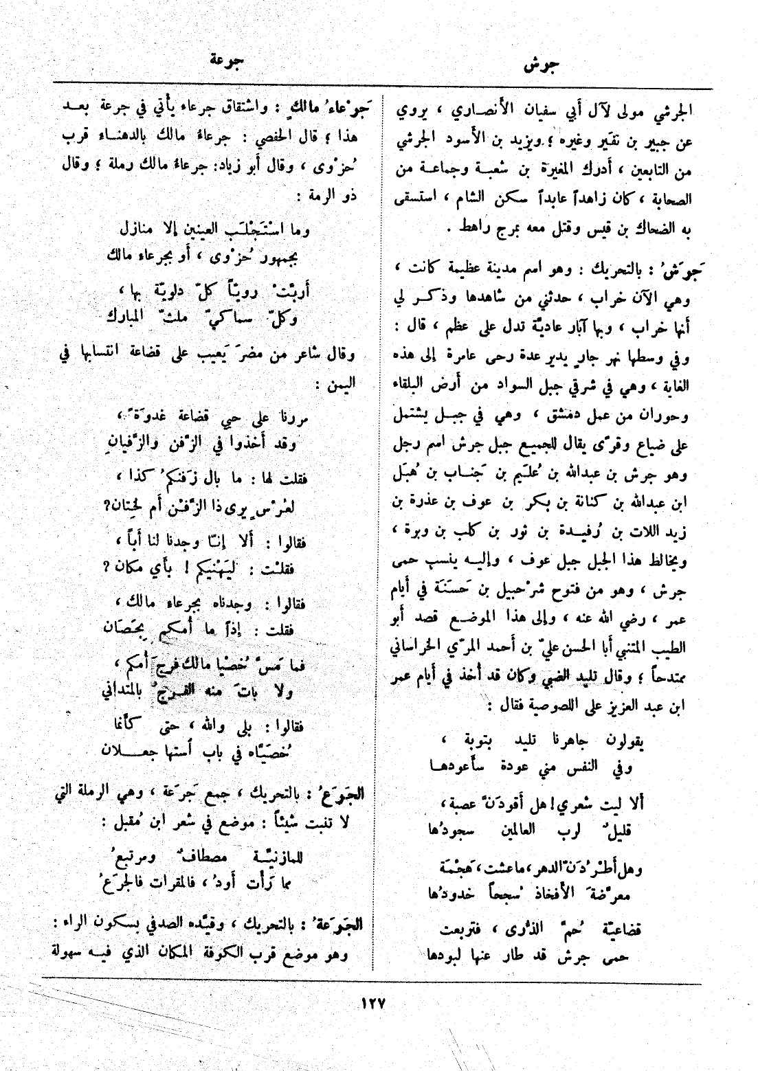 وفي وسطها نهر جار يدير عدة رحى عامرة إلى هذه الغاية، وهي في شرقي جبل السواد من أرض البلقاء وحوران من عمل دمشق، وهي في جبل يشتمل على ضياع وقرى يقال للجميع جبل جرش اسم رجل وهو جرش بن عبد الله بن عليم بن جناب بن هبل ابن عبد الله بن كنانة بن بكر بن عوف بن عذرة بن زيد اللات بن رفيدة بن ثور بن كلب بن وبرة، ويخالط هذا الجبل جبل عوف، وإليه ينسب حمى جرش، وهو من فتوح شرحبيل بن حسنة في أيام عمر، رضي الله عنه، وإلى هذا الموضع قصد أبو الطيب المتنبي أبا الحسن عليّ بن أحمد المرّي الخراساني ممتدحا وقال تليد الضبي وكان قد أخذ في أيام عمر ابن عبد العزيز على اللصوصية فقال: