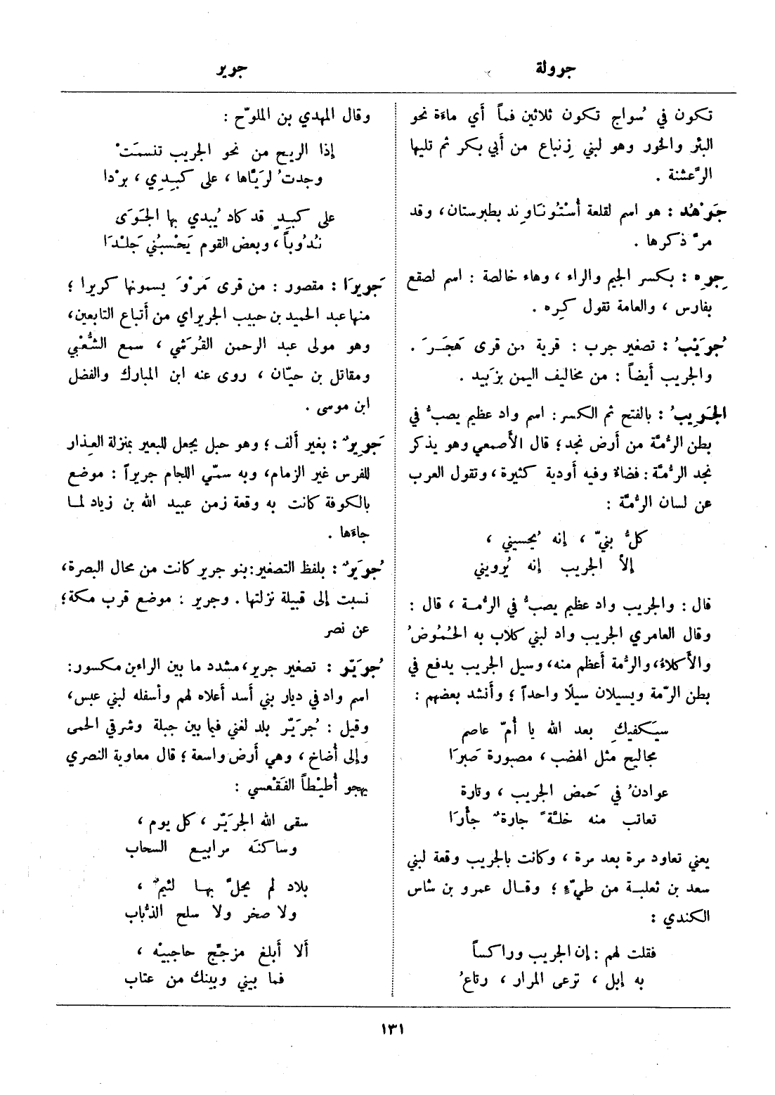 بغير ألف، وهو حبل يجعل للبعير بمنزلة العذار للفرس غير الزمام، وبه سمّي اللجام جريرا: موضع بالكوفة كانت به وقعة زمن عبيد الله بن زياد لما جاءها.