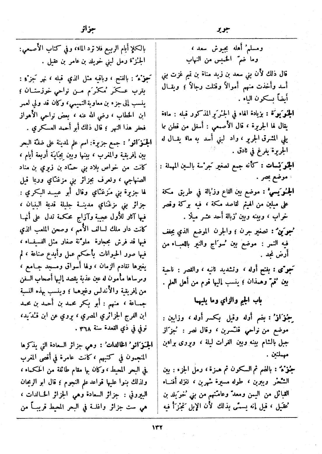 جمع جزيرة: اسم علم لمدينة على ضفّة البحر بين إفريقية والمغرب، بينها وبين بجاية أربعة أيام، كانت من خواص بلاد بني حمّاد بن زيري بن مناد الصنهاجي، وتعرف بجزائر بني مزغنّاي وربما قيل لها جزيرة بني مزغنّاي وقال أبو عبيد البكري: