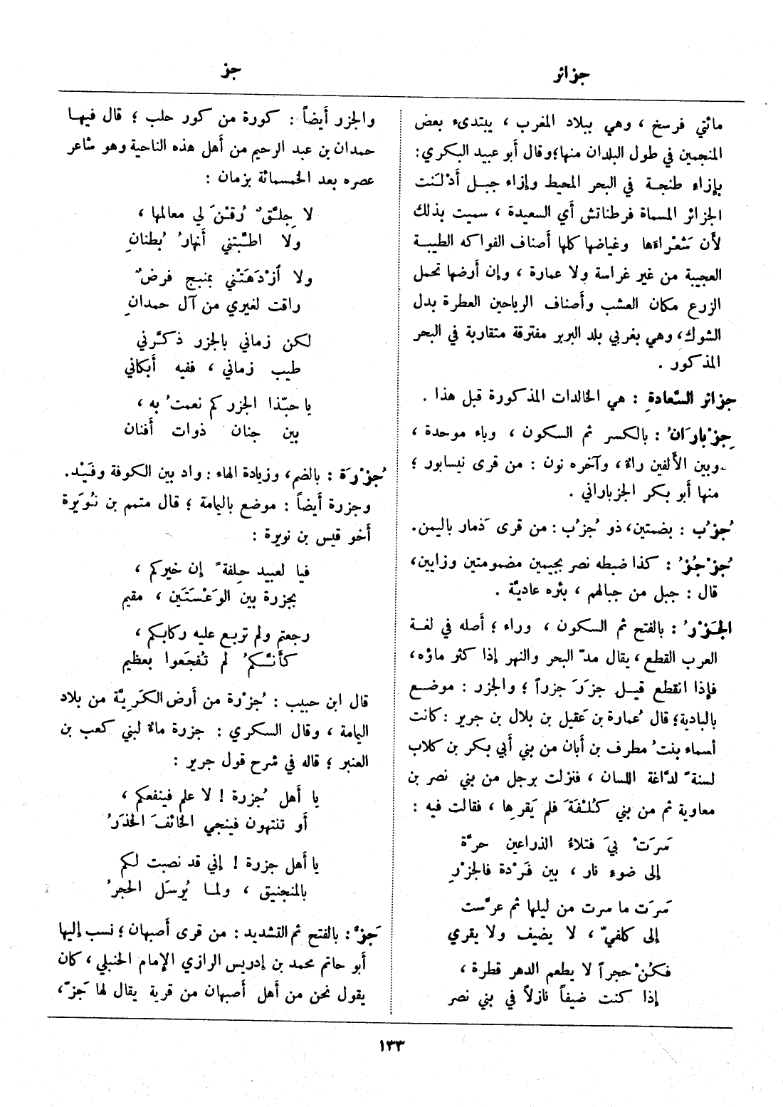 والجزر أيضا: كورة من كور حلب قال فيها حمدان بن عبد الرحيم من أهل هذه الناحية وهو شاعر عصره بعد الخمسمائة بزمان:
