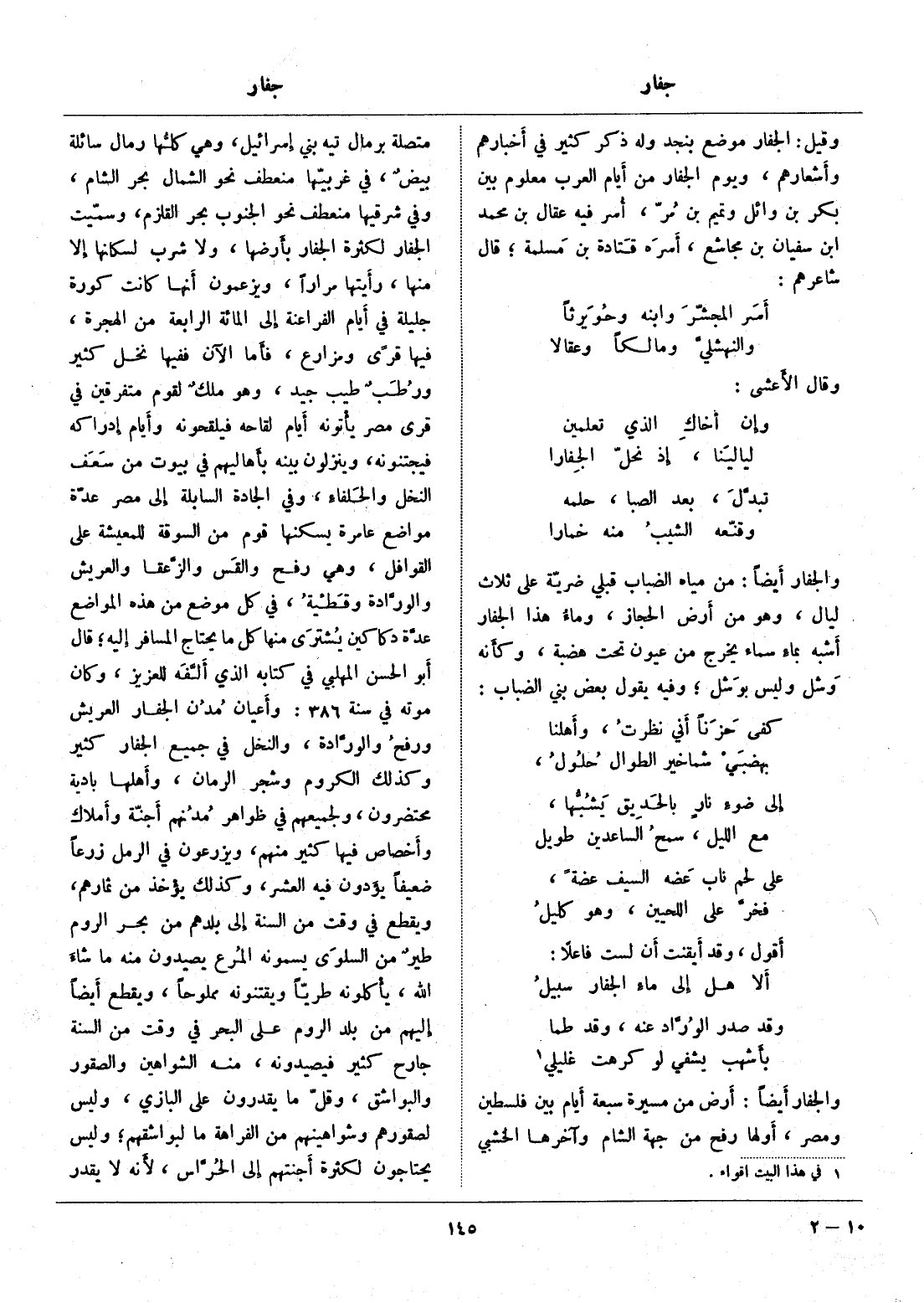 [1] والجفار أيضا: أرض من مسيرة سبعة أيام بين فلسطين ومصر، أولها رفح من جهة الشام وآخرها الخشبي متصلة برمال تيه بني إسرائيل، وهي كلّها رمال سائلة بيض، في غربيّها منعطف نحو الشمال بحر الشام، وفي شرقيها منعطف نحو الجنوب بحر القلزم، وسمّيت الجفار لكثرة الجفار بأرضها، ولا شرب لسكانها إلا منها، رأيتها مرارا، ويزعمون أنها كانت كورة جليلة في أيام الفراعنة إلى المائة الرابعة من الهجرة، فيها قرى ومزارع، فأما الآن ففيها نخل كثير ورطب طيب جيد، وهو ملك لقوم متفرقين في قرى مصر يأتونه أيام لقاحه فيلقحونه وأيام إدراكه فيجتنونه، وينزلون بينه بأهاليهم في بيوت من سعف النخل والحلفاء، وفي الجادة السابلة إلى مصر عدّة مواضع عامرة يسكنها قوم من السوقة للمعيشة على القوافل، وهي رفح والقس والزّعقا والعريش والورّادة وقطية، في كل موضع من هذه المواضع عدّة دكاكين يشترى منها كل ما يحتاج المسافر إليه قال أبو الحسن المهلبي في كتابه الذي ألّفه للعزيز، وكان موته في سنة 386: وأعيان مدن الجفار العريش ورفح والورّادة، والنخل في جميع الجفار كثير وكذلك الكروم وشجر الرمان، وأهلها بادية محتضرون، ولجميعهم في ظواهر مدنهم أجنّة وأملاك وأخصاص فيها كثير منهم، ويزرعون في الرمل زرعا ضعيفا يؤدون فيه العشر، وكذلك يؤخذ من ثمارهم، ويقطع في وقت من السنة إلى بلدهم من بحر الروم طير من السلوى يسمونه المرع يصيدون منه ما شاء الله، يأكلونه طريّا ويقتنونه مملوحا، ويقطع أيضا إليهم من بلد الروم على البحر في وقت من السنة جارح كثير فيصيدونه، منه الشواهين والصقور والبواشق، وقلّ ما يقدرون على البازي، وليس لصقورهم وشواهينهم من الفراهة ما لبواشقهم وليس يحتاجون لكثرة أجنتهم إلى الحرّاس، لأنه لا يقدر