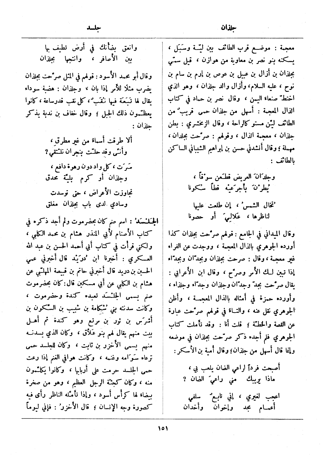 معجمة: موضع قرب الطائف بين ليّة وسبل، يسكنه بنو نصر بن معاوية من هوازن، قيل سمّي بجلذان بن أزال بن عبيل بن عوص بن إرم بن سام بن نوح، عليه السلام، وأزال والد جلذان، وهو الذي اختطّ صنعاء اليمن، وقال نصر بن حماد في كتاب الذال المعجمة: أسهل من جلذان حمى قريب من الطائف ليّن مستو كالراحة، وقال الزمخشري: بطن جلذان، معجمة الذال، وقولهم: صرّحت بجلدان، مهملة وقال أنشدني حسن بن إبراهيم الشيباني الساكن بالطائف: