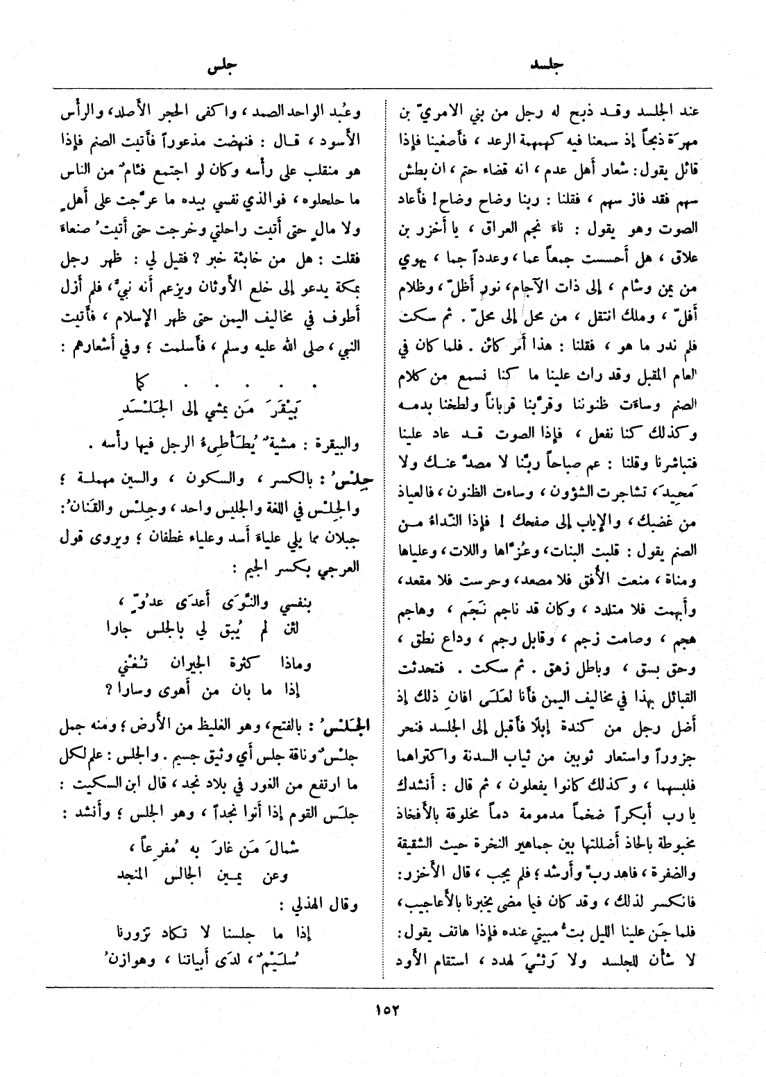 عند الجلسد وقد ذبح له رجل من بني الامريّ بن مهرة ذبحا إذ سمعنا فيه كهمهمة الرعد، فأصغينا فإذا قائل يقول: شعار أهل عدم، انه قضاء حتم، ان بطش سهم فقد فاز سهم، فقلنا: ربنا وضاح وضاح! فأعاد الصوت وهو يقول: ناء نجم العراق، يا أخزر بن علاق، هل أحسست جمعا عما، وعددا جما، يهوي من يمن وشام، إلى ذات الآجام، نور أظلّ، وظلام أفلّ، وملك انتقل، من محل إلى محلّ. ثم سكت فلم ندر ما هو، فقلنا: هذا أمر كائن. فلما كان في العام المقبل وقد راث علينا ما كنا نسمع من كلام الصنم وساءت ظنوننا وقرّبنا قربانا ولطخنا بدمه وكذلك كنا نفعل، فإذا الصوت قد عاد علينا فتباشرنا وقلنا: عم صباحا ربّنا لا مصدّ عنك ولا محيد، تشاجرت الشئون، وساءت الظنون، فالعياذ من غضبك، والإياب إلى صفحك! فإذا النّداء من الصنم يقول: قلبت البنات، وعزّاها واللات، وعلياها ومناة، منعت الأفق فلا مصعد، وحرست فلا مقعد، وأبهمت فلا متلدد، وكان قد ناجم نجم، وهاجم هجم، وصامت زجم، وقابل رجم، وداع نطق، وحق بسق، وباطل زهق. ثم سكت. فتحدثت القبائل بهذا في مخاليف اليمن فأنا لعلى افان ذلك إذ أضل رجل من كندة إبلا فأقبل إلى الجلسد فنحر جزورا واستعار ثوبين من ثياب السدنة واكتراهما فلبسهما، وكذلك كانوا يفعلون، ثم قال: أنشدك يا رب أبكرا ضخما مدمومة دما مخلوقة بالأفخاذ مخبوطة بالحاذ أضللتها بين جماهير النخرة حيث الشقيقة والضفرة، فاهد ربّ وأرشد فلم يجب، قال الأخزر: