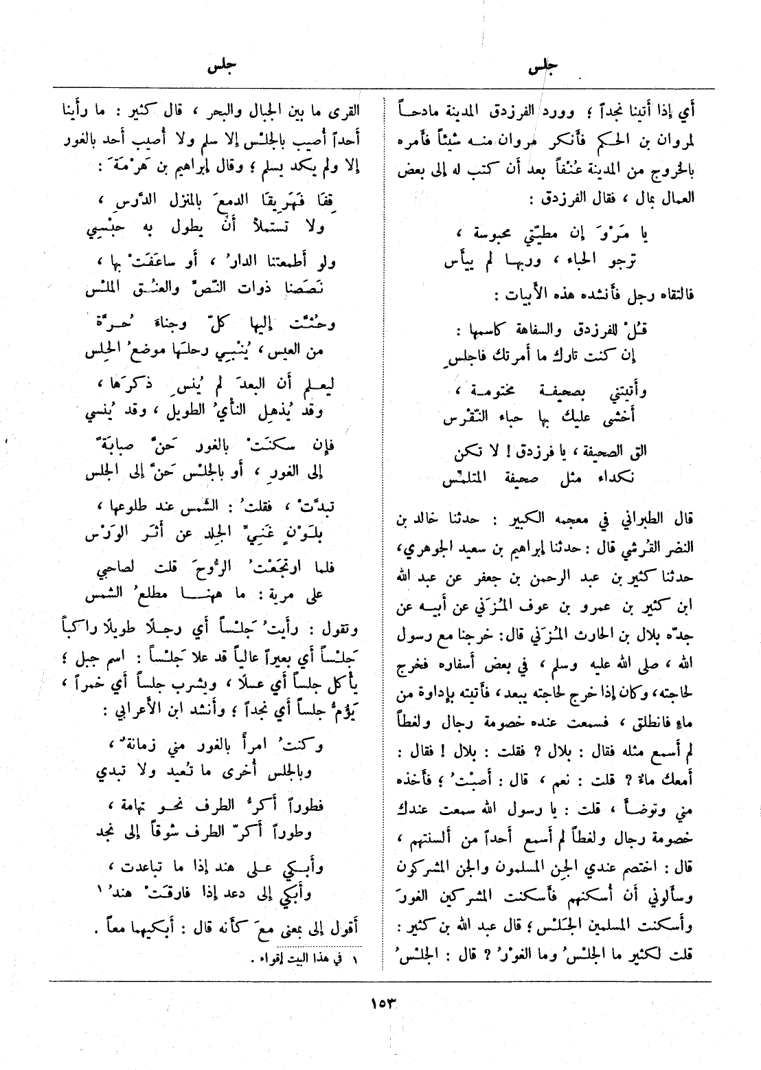 قلت لكثير ما الجلس وما الغور؟ قال: الجلس القرى ما بين الجبال والبحر، قال كثير: ما رأينا أحدا أصيب بالجلس إلا سلم ولا أصيب أحد بالغور إلا ولم يكد يسلم وقال إبراهيم بن هرمة: