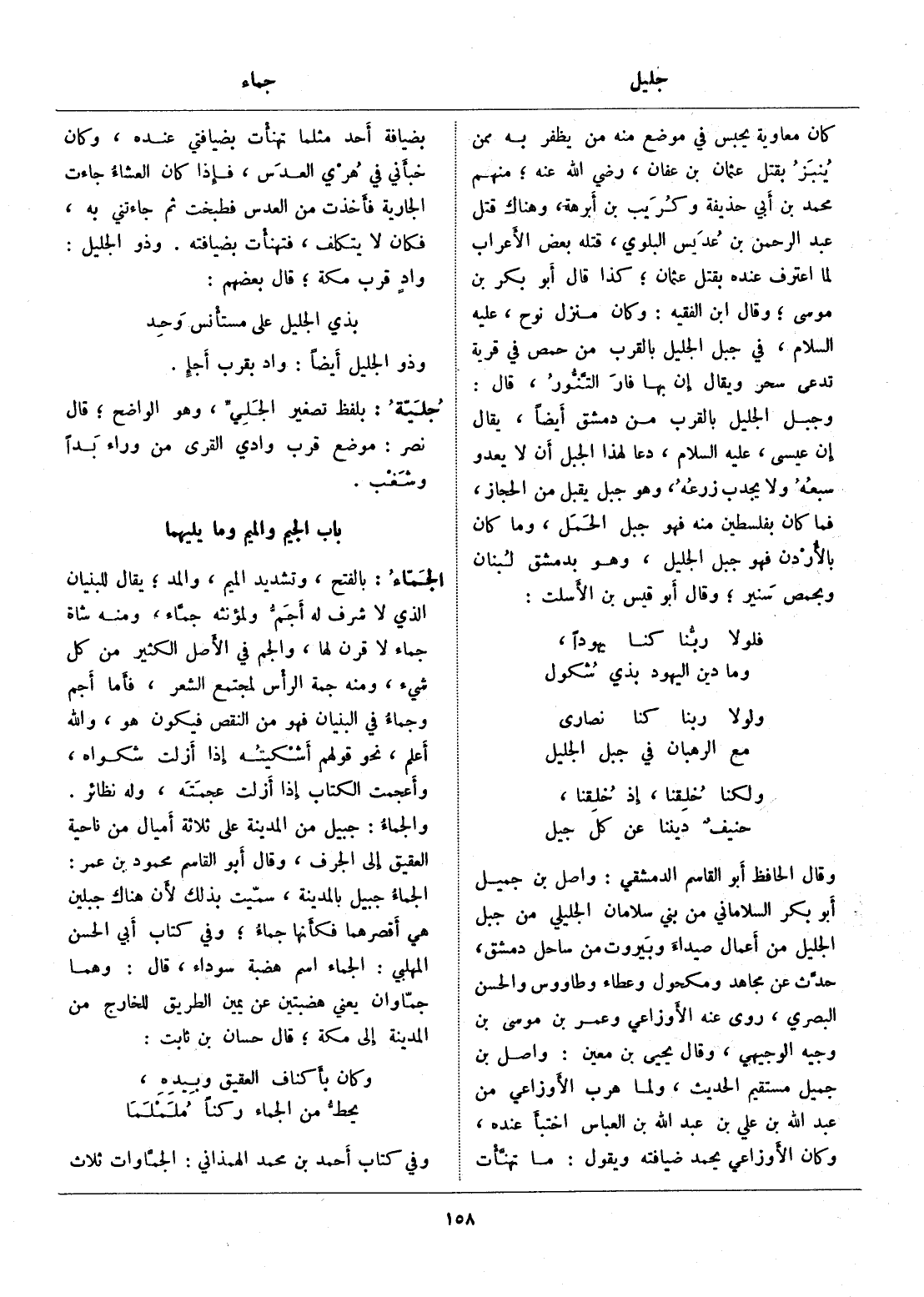 وجبل الجليل بالقرب من دمشق أيضا، يقال إن عيسى، عليه السلام، دعا لهذا الجبل أن لا يعدو سبعه ولا يجدب زرعه، وهو جبل يقبل من الحجاز، فما كان بفلسطين منه فهو جبل الحمل، وما كان بالأردن فهو جبل الجليل، وهو بدمشق لبنان وبحمص سنير وقال أبو قيس بن الأسلت: