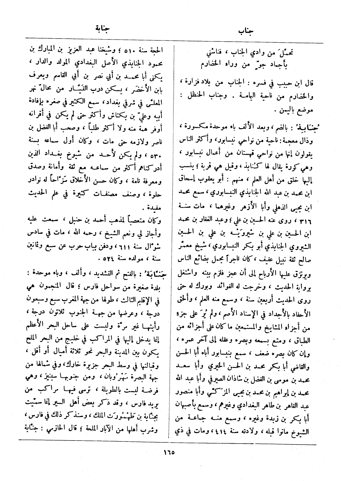 بالضم، وبعد الألف باء موحدة مكسورة، وذال معجمة: ناحية من نواحي نيسابور، وأكثر الناس يقولون إنها من نواحي قهستان من أعمال نيسابور، وهي كورة يقال لها كنابذ، وقيل هي قرية ينسب إليها خلق من أهل العلم، منهم: أبو يعقوب إسحاق ابن محمد بن عبد الله الجنابذي النيسابوري، سمع محمد ابن يحيى الذهلي وأبا الأزهر وغيرهما، مات سنة 316، روى عنه الحسين بن علي وعبد الغفار بن محمد ابن الحسين بن علي بن شيرويه بن علي بن الحسين الشيروي الجنابذي أبو بكر النيسابوري، شيخ معمّر صالح ثقة نبيل عفيف، كان تاجرا يحمل بضائع الناس ويرتزق عليها الأرباح إلى أن عجز فلزم بيته واشتغل برواية الحديث، وخرجت له الفوائد وبورك له حتى روى الحديث أربعين سنة، وسمع منه العلم، وألحق الأحفاد بالأجداد في الإسناد الأصم، ولم ير على جزء من أجزاء المشايخ والمستمعين ما كان على أجزائه من الطباق، ومتع بسمعه وبصره وعقله إلى آخر عمره، وإن كان بصره ضعف، سمع بنيسابور أباه أبا الحسن والقاضي أبا بكر محمد بن الحسن الخيري وأبا سعد محمد بن موسى بن الفضل بن شاذان الصيرفي وأبا عبد الله محمد بن إبراهيم بن محمد بن يحيى المزكّي وأبا منصور عبد القاهر بن طاهر البغدادي وغيرهم، وسمع بأصبهان أبا بكر بن زبدة وغيره، وسمع منه جماعة من الشيوخ ماتوا قبله، ولادته سنة 414، ومات في ذي الحجة سنة 510 وشيخنا عبد العزيز بن المبارك بن محمود الجنابذي الأصل البغدادي المولد والدار، يكنى أبا محمد بن أبي نصر بن أبي القاسم ويعرف بابن الأخضر، يسكن درب القيّار من محالّ نهر المعلّى في شرقي بغداد، سمع الكثير في صغره بإفادة أبيه وعليّ بن بكتاش وأكثر حتى لم يكن في أقرانه أوفر همة منه ولا أكثر طلبا، وصحب أبا الفضل بن ناصر ولازمه حتى مات، وكان أول سماعه بسنة 530، ولم يكن لأحد من شيوخ بغداد الذين أدركناهم أكثر من سماعه مع ثقة وأمانة وصدق ومعرفة تامة، وكان حسن الأخلاق مزّاحا له نوادر حلوة، وصنف مصنفات كثيرة في علم الحديث مفيدة.