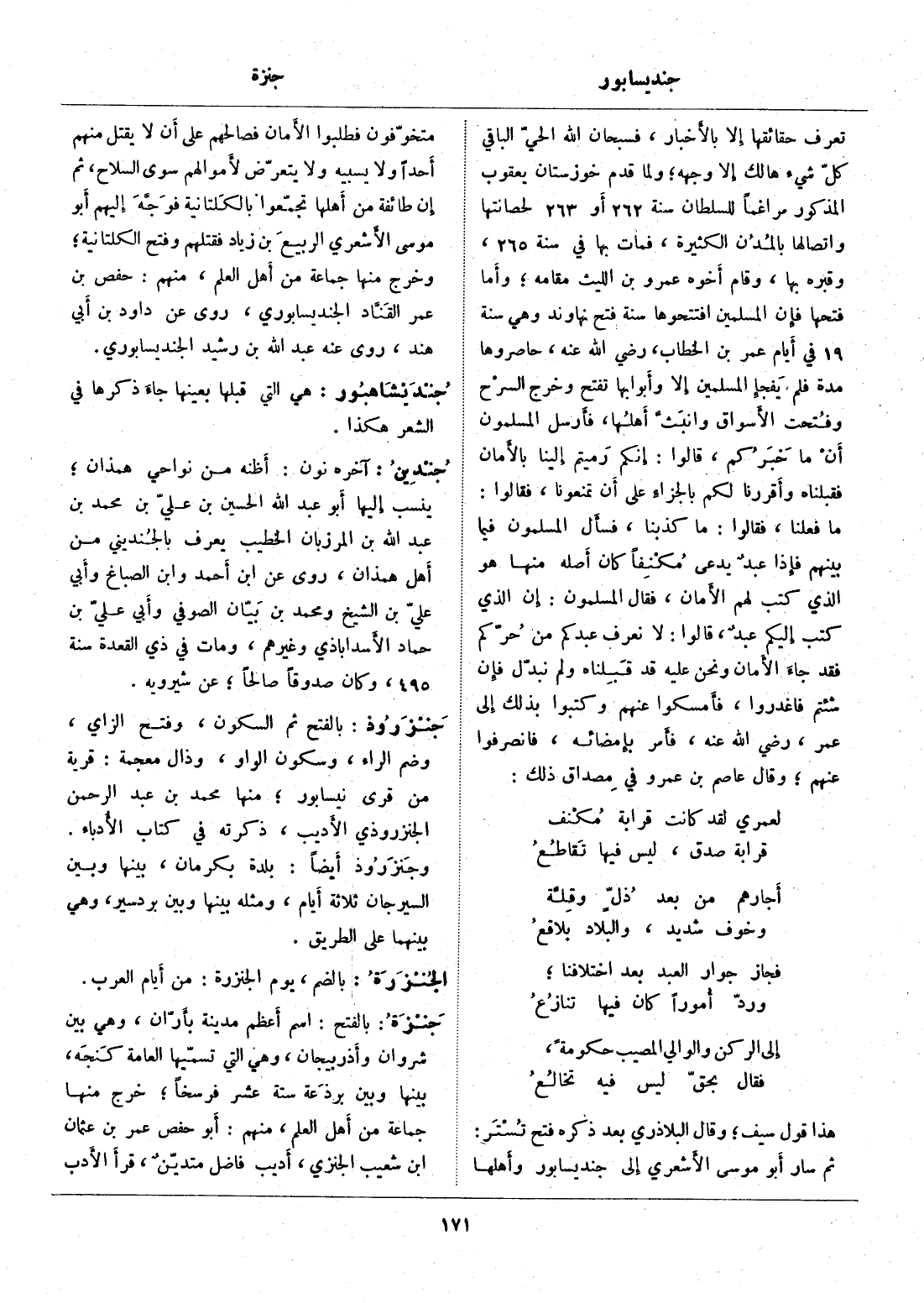 تعرف حقائقها إلا بالأخبار، فسبحان الله الحيّ الباقي كُلُّ شَيْءٍ هالِكٌ إِلَّا وَجْهَهُ 28: 88 ولما قدم خوزستان يعقوب المذكور مراغما للسلطان سنة 262 أو 263 لحصانتها واتصالها بالمدن الكثيرة، فمات بها في سنة 265، وقبره بها، وقام أخوه عمرو بن الليث مقامه وأما فتحها فإن المسلمين افتتحوها سنة فتح نهاوند وهي سنة 19 في أيام عمر بن الخطاب، رضي الله عنه، حاصروها مدة فلم يفجإ المسلمين إلا وأبوابها تفتح وخرج السرح وفتحت الأسواق وانبثّ أهلها، فأرسل المسلمون أن ما خبركم، قالوا: إنكم رميتم إلينا بالأمان فقبلناه وأقررنا لكم بالجزاء على أن تمنعونا، فقالوا: