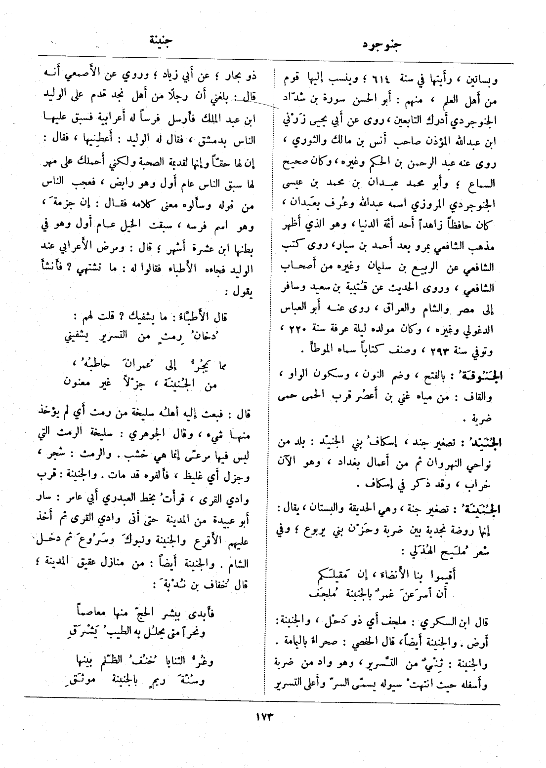 قال: فبعث إليه أهله سليخة من رمث أي لم يؤخذ منها شيء، وقال الجوهري: سليخة الرمث التي ليس فيها مرعى إنما هي خشب. والرمث: شجر، وجزل أي غليظ، فألفوه قد مات. والجنينة: قرب وادي القرى، قرأت بخط العبدري أبي عامر: سار أبو عبيدة من المدينة حتى أتى وادي القرى ثم أخذ عليهم الأقرع والجنينة وتبوك وسروع ثم دخل الشام. والجنينة أيضا: من منازل عقيق المدينة قال خفاف بن ندبة:
