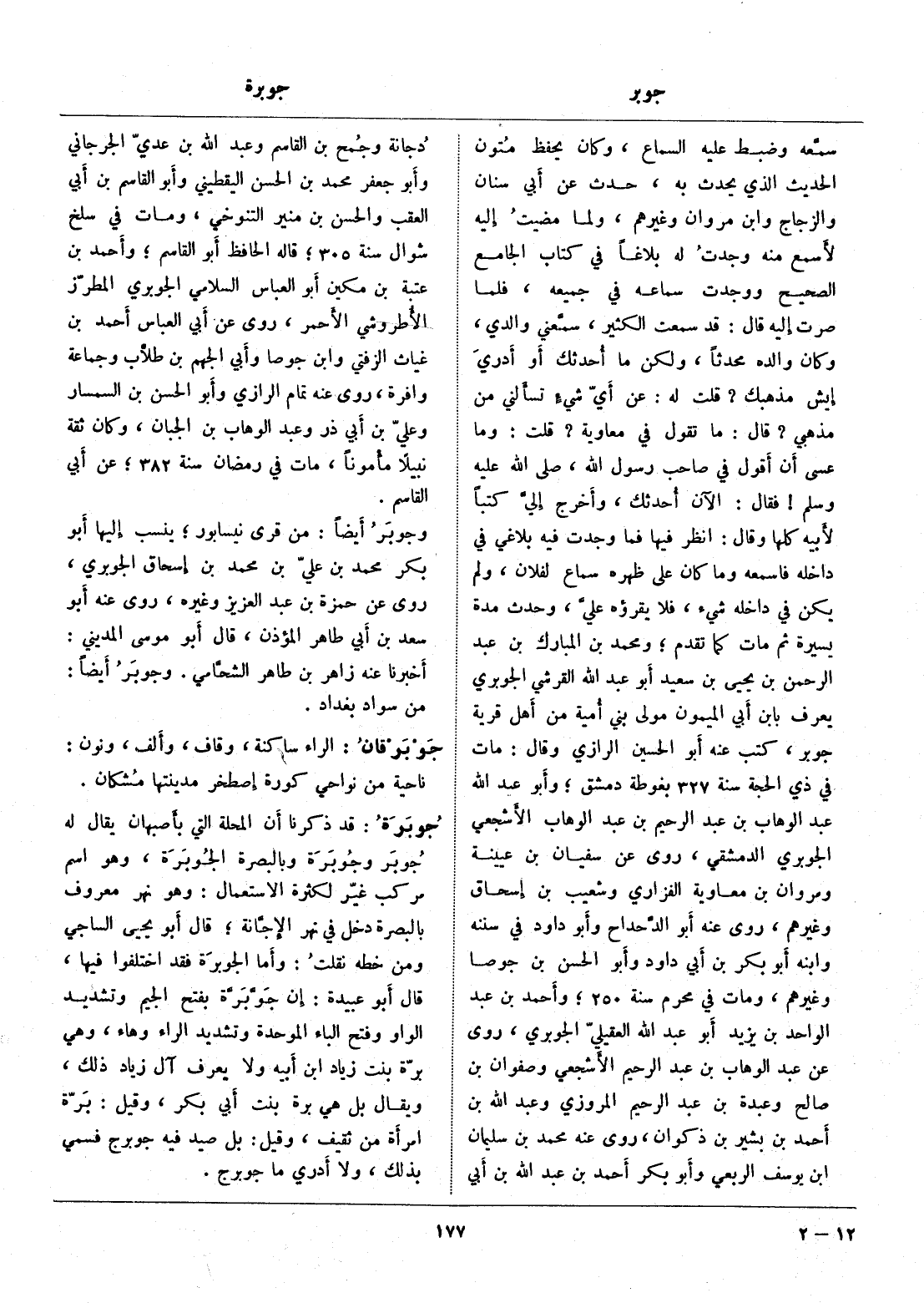 سمّعه وضبط عليه السماع، وكان يحفظ متون الحديث الذي يحدث به، حدث عن أبي سنان والزجاج وابن مروان وغيرهم، ولما مضيت إليه لأسمع منه وجدت له بلاغا في كتاب الجامع الصحيح ووجدت سماعه في جميعه، فلما صرت إليه قال: قد سمعت الكثير، سمّعني والدي، وكان والده محدثا، ولكن ما أحدثك أو أدري أيش مذهبك؟ قلت له: عن أيّ شيء تسألني من مذهبي؟ قال: ما تقول في معاوية؟ قلت: وما عسى أن أقول في صاحب رسول الله، صلى الله عليه وسلم! فقال: الآن أحدثك، وأخرج إليّ كتبا لأبيه كلها وقال: انظر فيها فما وجدت فيه بلاغي في داخله فاسمعه وما كان على ظهره سماع لفلان، ولم يكن في داخله شيء، فلا يقرؤه عليّ، وحدث مدة يسيرة ثم مات كما تقدم ومحمد بن المبارك بن عبد الرحمن بن يحيى بن سعيد أبو عبد الله القرشي الجوبري يعرف بابن أبي الميمون مولى بني أمية من أهل قرية جوبر، كتب عنه أبو الحسين الرازي وقال: مات في ذي الحجة سنة 327 بغوطة دمشق وأبو عبد الله عبد الوهاب بن عبد الرحيم بن عبد الوهاب الأشجعي الجوبري الدمشقي، روى عن سفيان بن عيينة ومروان بن معاوية الفزاري وشعيب بن إسحاق وغيرهم، روى عنه أبو الدّحداح وأبو داود في سننه وابنه أبو بكر بن أبي داود وأبو الحسن بن جوصا وغيرهم، ومات في محرم سنة 250 وأحمد بن عبد الواحد بن يزيد أبو عبد الله العقيليّ الجوبري، روى عن عبد الوهاب بن عبد الرحيم الأشجعي وصفوان بن صالح وعبدة بن عبد الرحيم المروزي وعبد الله بن أحمد بن بشير بن ذكوان، روى عنه محمد بن سليمان ابن يوسف الربعي وأبو بكر أحمد بن عبد الله بن أبي دجانة وجمح بن القاسم وعبد الله بن عديّ الجرجاني وأبو جعفر محمد بن الحسن اليقطيني وأبو القاسم بن أبي العقب والحسن بن منير التنوخي، ومات في سلخ شوال سنة 305 قاله الحافظ أبو القاسم وأحمد بن عتبة بن مكين أبو العباس السلامي الجوبري المطرّز الأطروشي الأحمر، روى عن أبي العباس أحمد بن غياث الزفتي وابن جوصا وأبي الجهم بن طلّاب وجماعة وافرة، روى عنه تمام الرازي وأبو الحسن بن السمسار وعليّ بن أبي ذر وعبد الوهاب بن الجبان، وكان ثقة نبيلا مأمونا، مات في رمضان سنة 382 عن أبي القاسم.