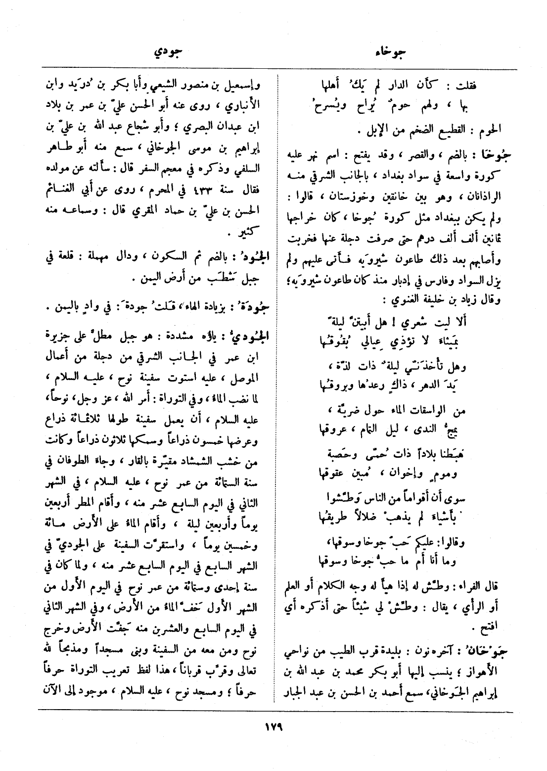ياؤه مشددة: هو جبل مطلّ على جزيرة ابن عمر في الجانب الشرقي من دجلة من أعمال الموصل، عليه استوت سفينة نوح، عليه السلام، لما نضب الماء، وفي التوراة: أمر الله، عز وجل، نوحا، عليه السلام، أن يعمل سفينة طولها ثلاثمائة ذراع وعرضها خمسون ذراعا وسمكها ثلاثون ذراعا وكانت من خشب الشمشاد مقيّرة بالقار، وجاء الطوفان في سنة الستمائة من عمر نوح، عليه السلام، في الشهر الثاني في اليوم السابع عشر منه، وأقام المطر أربعين يوما وأربعين ليلة، وأقام الماء على الأرض مائة وخمسين يوما، واستقرّت السفينة على الجوديّ في الشهر السابع في اليوم السابع عشر منه، ولما كان في سنة إحدى وستمائة من عمر نوح في اليوم الأول من الشهر الأول خفّ الماء من الأرض، وفي الشهر الثاني في اليوم السابع والعشرين منه جفّت الأرض وخرج نوح ومن معه من السفينة وبنى مسجدا ومذبحا لله تعالى وقرّب قربانا، هذا لفظ تعريب التوراة حرفا حرفا ومسجد نوح، عليه السلام، موجود إلى الآن
