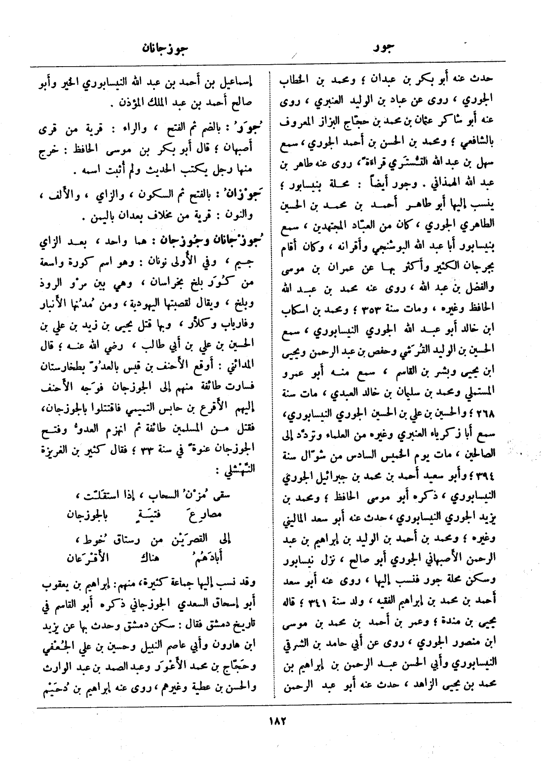 هما واحد، بعد الزاي جيم، وفي الأولى نونان: وهو اسم كورة واسعة من كور بلخ بخراسان، وهي بين مرو الروذ وبلخ، ويقال لقصبتها اليهودية، ومن مدنها الأنبار وفارياب وكلّار، وبها قتل يحيى بن زيد بن علي بن الحسين بن علي بن أبي طالب، رضي الله عنه قال المدائني: أوقع الأحنف بن قيس بالعدوّ بطخارستان فسارت طائفة منهم إلى الجوزجان فوجه الأحنف إليهم الأقرع بن حابس التميمي فاقتتلوا بالجوزجان، فقتل من المسلمين طائفة ثم انهزم العدوّ وفتح الجوزجان عنوة في سنة 33 فقال كثير بن الغريزة النّهشلي:
