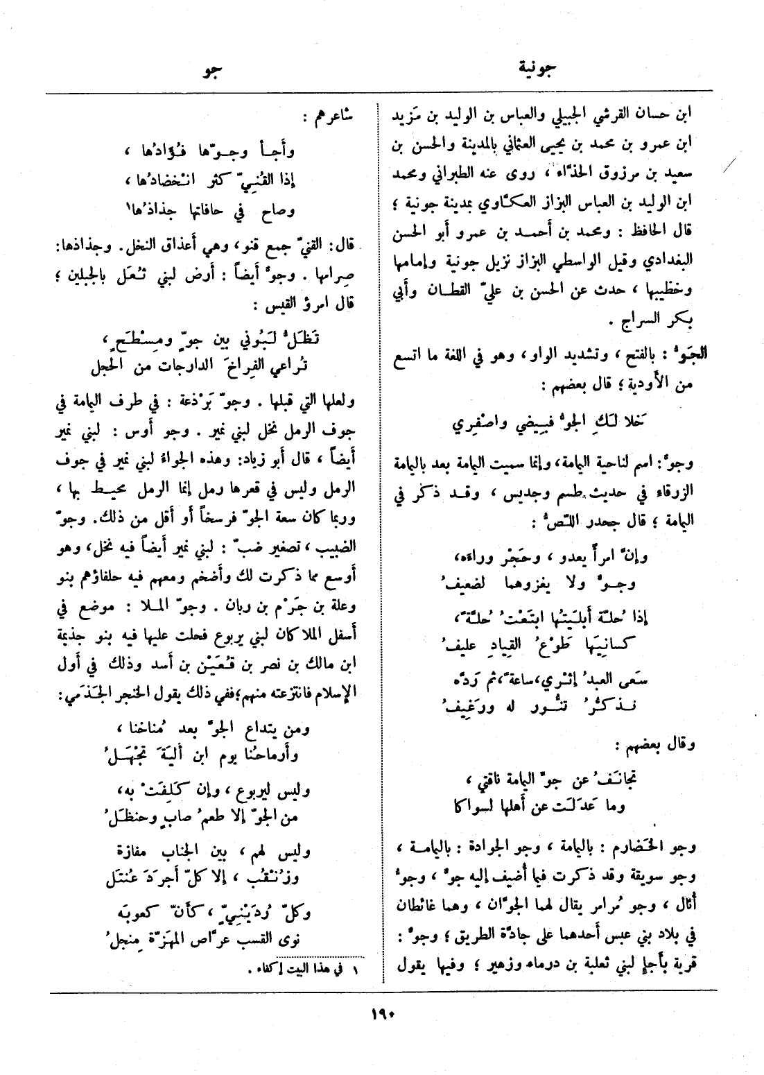 ولعلها التي قبلها. وجوّ برذعة: في طرف اليمامة في جوف الرمل نخل لبني نمير. وجو أوس: لبني نمير أيضا، قال أبو زياد: وهذه الجواء لبني نمير في جوف الرمل وليس في قعرها رمل إنما الرمل محيط بها، وربما كان سعة الجوّ فرسخا أو أقل من ذلك. وجوّ الضبيب، تصغير ضبّ: لبني نمير أيضا فيه نخل، وهو أوسع مما ذكرت لك وأضخم ومعهم فيه حلفاؤهم بنو وعلة بن جرم بن ربان. وجوّ الملا: موضع في أسفل الملا كان لبني يربوع فحلت عليها فيه بنو جذيمة ابن مالك بن نصر بن قعين بن أسد وذلك في أول الإسلام فانتزعته منهم، ففي ذلك يقول الخنجر الجذمي: