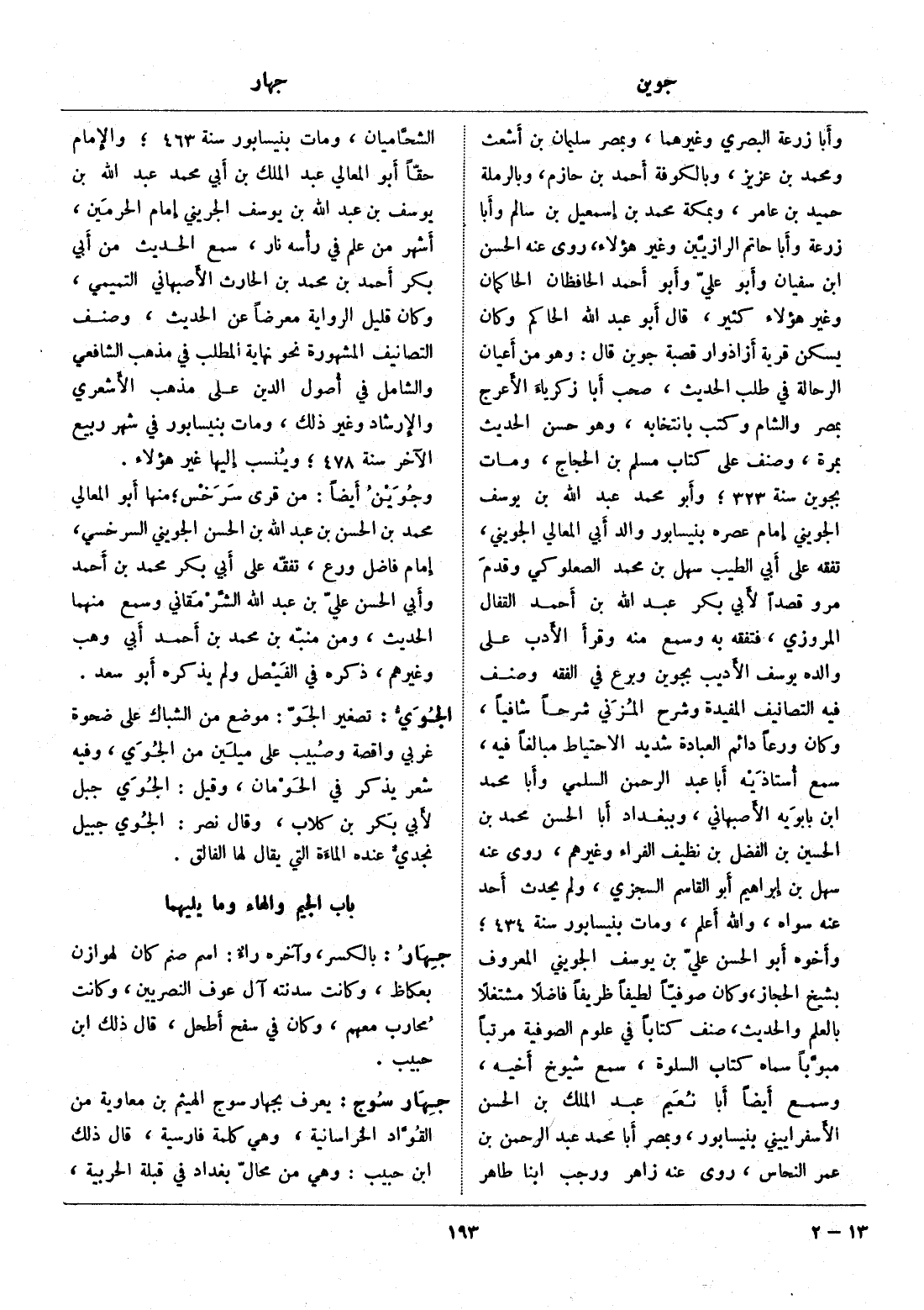 وأبا زرعة البصري وغيرهما، وبمصر سليمان بن أشعث ومحمد بن عزيز، وبالكوفة أحمد بن حازم، وبالرملة حميد بن عامر، وبمكة محمد بن إسمعيل بن سالم وأبا زرعة وأبا حاتم الرازيّين وغير هؤلاء، روى عنه الحسن ابن سفيان وأبو عليّ وأبو أحمد الحافظان الحاكمان وغير هؤلاء كثير، قال أبو عبد الله الحاكم وكان يسكن قرية أزاذوار قصبة جوين قال: وهو من أعيان الرحالة في طلب الحديث، صحب أبا زكرياء الأعرج بمصر والشام وكتب بانتخابه، وهو حسن الحديث بمرة، وصنف على كتاب مسلم بن الحجاج، ومات بجوين سنة 323، وأبو محمد عبد الله بن يوسف الجويني إمام عصره بنيسابور والد أبي المعالي الجويني، تفقه على أبي الطيب سهل بن محمد الصعلوكي وقدم مرو قصدا لأبي بكر عبد الله بن أحمد القفال المروزي، فتفقه به وسمع منه وقرأ الأدب على والده يوسف الأديب بجوين وبرع في الفقه وصنف فيه التصانيف المفيدة وشرح المزني شرحا شافيا، وكان ورعا دائم العبادة شديد الاحتياط مبالغا فيه، سمع أستاذيه أبا عبد الرحمن السلمي وأبا محمد ابن بابويه الأصبهاني، وببغداد أبا الحسن محمد بن الحسين بن الفضل بن نظيف الفراء وغيرهم، روى عنه سهل بن إبراهيم أبو القاسم السجزي، ولم يحدث أحد عنه سواه، والله أعلم، ومات بنيسابور سنة 434، وأخوه أبو الحسن عليّ بن يوسف الجويني المعروف بشيخ الحجاز، وكان صوفيّا لطيفا ظريفا فاضلا مشتغلا بالعلم والحديث، صنف كتابا في علوم الصوفية مرتبا مبوّبا سماه كتاب السلوة، سمع شيوخ أخيه، وسمع أيضا أبا نعيم عبد الملك بن الحسن الأسفراييني بنيسابور، وبمصر أبا محمد عبد الرحمن بن عمر النحاس، روى عنه زاهر ورجب ابنا طاهر الشحّاميان، ومات بنيسابور سنة 463، والإمام حقّا أبو المعالي عبد الملك بن أبي محمد عبد الله بن يوسف بن عبد الله بن يوسف الجريني إمام الحرمين، أشهر من علم في رأسه نار، سمع الحديث من أبي بكر أحمد بن محمد بن الحارث الأصبهاني التميمي، وكان قليل الرواية معرضا عن الحديث، وصنف التصانيف المشهورة نحو نهاية المطلب في مذهب الشافعي والشامل في أصول الدين على مذهب الأشعري والإرشاد وغير ذلك، ومات بنيسابور في شهر ربيع الآخر سنة 478، وينسب إليها غير هؤلاء.