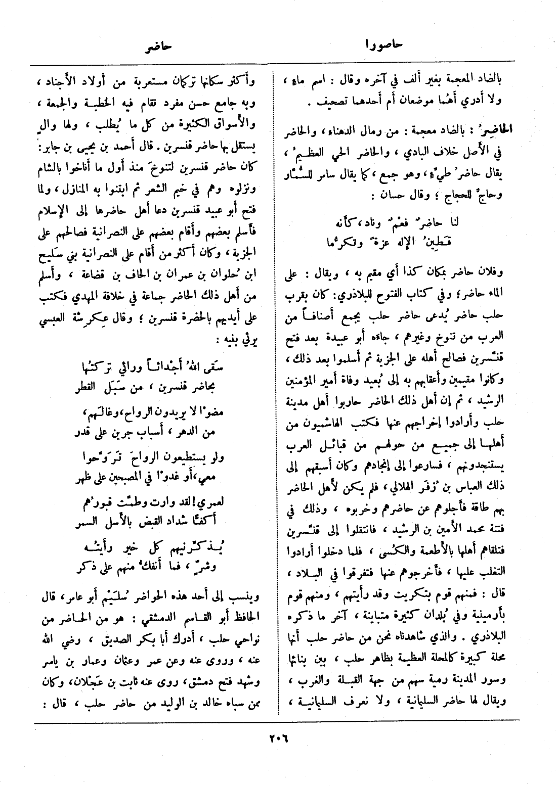 وفلان حاضر بمكان كذا أي مقيم به، ويقال: على الماء حاضر، وفي كتاب الفتوح للبلاذري: كان بقرب حلب حاضر يدعى حاضر حلب بجمع أصنافا من العرب من تنوخ وغيرهم، جاءه أبو عبيدة بعد فتح قنّسرين فصالح أهله على الجزية ثم أسلموا بعد ذلك، وكانوا مقيمين وأعقابهم به إلى بعيد وفاة أمير المؤمنين الرشيد، ثم إن أهل ذلك الحاضر حاربوا أهل مدينة حلب وأرادوا إخراجهم عنها فكتب الهاشميون من أهلها إلى جميع من حولهم من قبائل العرب يستنجدونهم، فسارعوا إلى إنجادهم وكان أسبقهم إلى ذلك العباس بن زفر الهلالي، فلم يكن لأهل الحاضر بهم طاقة فأجلوهم عن حاضرهم وخربوه، وذلك في فتنة محمد الأمين بن الرشيد، فانتقلوا إلى قنّسرين فتلقاهم أهلها بالأطعمة والكسى، فلما دخلوا أرادوا التغلب عليها، فأخرجوهم عنها فتفرقوا في البلاد، قال: فمنهم قوم بتكريت وقد رأيتهم، ومنهم قوم بأرمينية وفي بلدان كثيرة متباينة، آخر ما ذكره البلاذري. والذي شاهدناه نحن من حاضر حلب أنها محلة كبيرة كالمحلة العظيمة بظاهر حلب، بين بنائها وسور المدينة رمية سهم من جهة القبلة والغرب، ويقال لها حاضر السليمانية، ولا نعرف السليمانية، وأكثر سكانها تركمان مستعربة من أولاد الأجناد، وبه جامع حسن مفرد تقام فيه الخطبة والجمعة، والأسواق الكثيرة من كل ما يطلب، ولها وال يستقل بها حاضر قنسرين. قال أحمد بن يحيى بن جابر: