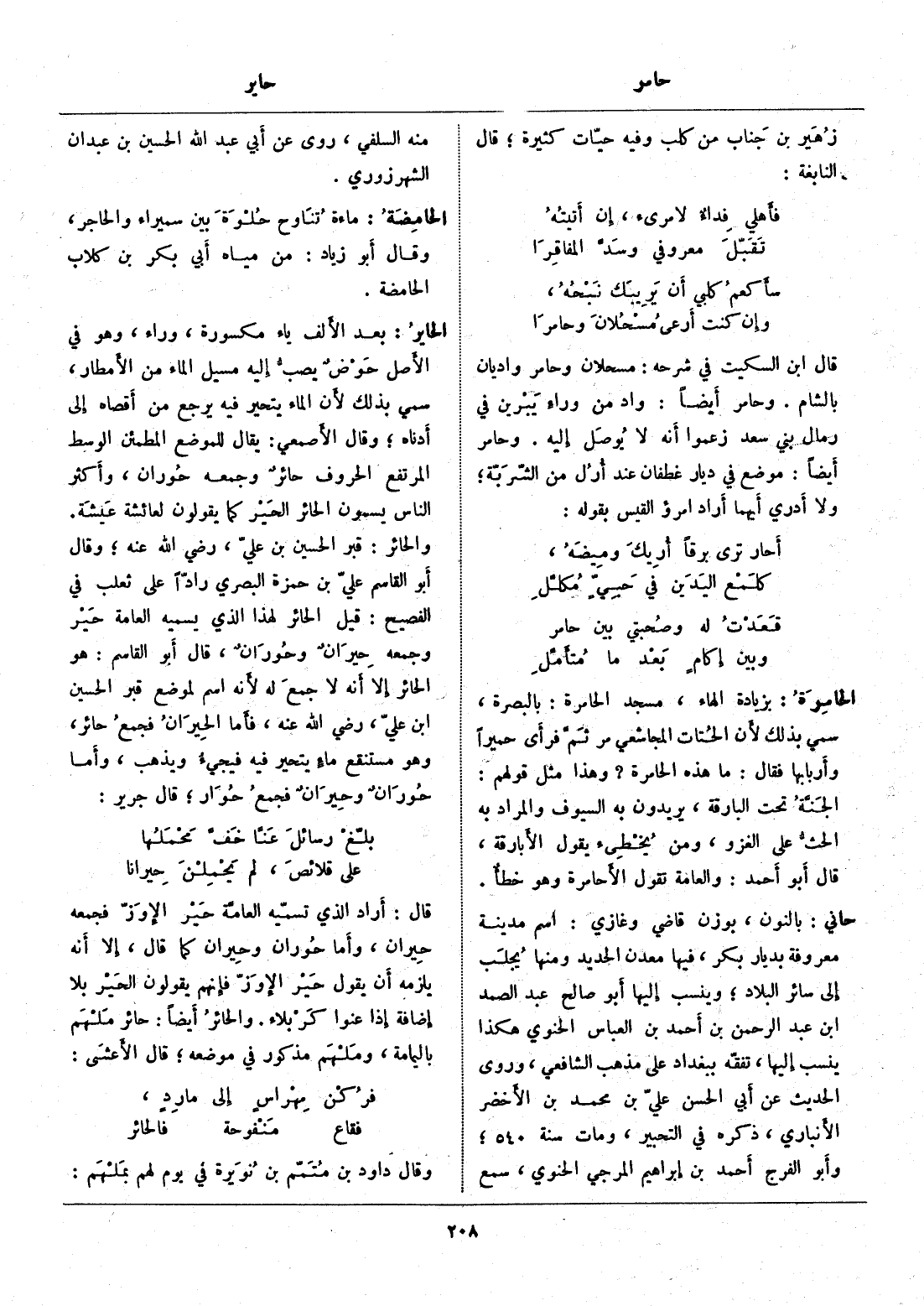 قال: أراد الذي تسمّيه العامّة حير الإوزّ فجمعه حيران، وأما حوران وحيران كما قال، إلا أنه يلزمه أن يقول حير الإوزّ فإنهم يقولون الحير بلا إضافة إذا عنوا كربلاء. والحائر أيضا: حائر ملهم باليمامة، وملهم مذكور في موضعه، قال الأعشى: