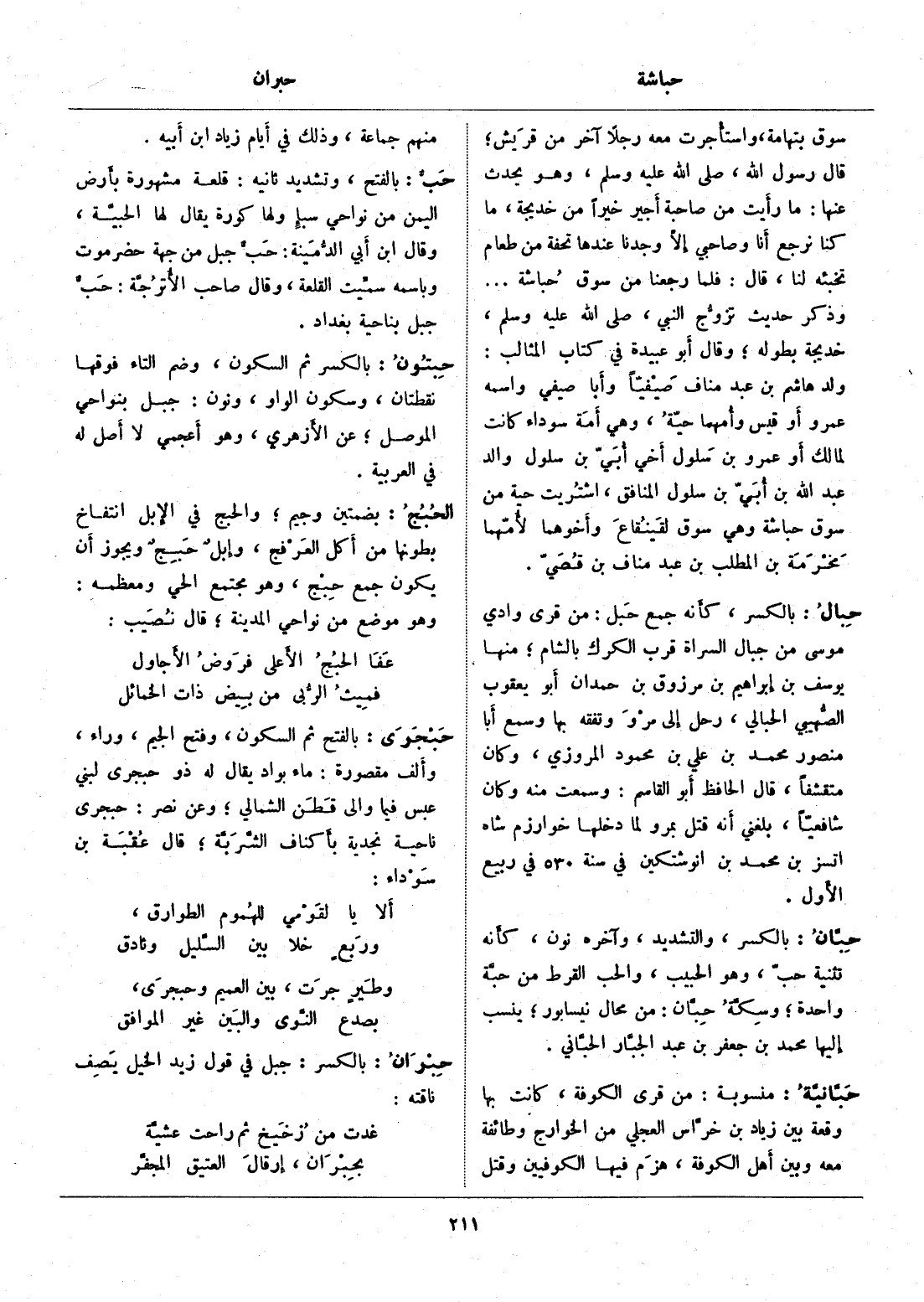 سوق بتهامة، واستأجرت معه رجلا آخر من قريش، قال رسول الله، صلى الله عليه وسلم، وهو يحدث عنها: ما رأيت من صاحبة أجير خيرا من خديجة، ما كنا ترجع أنا وصاحبي إلّا وجدنا عندها تحفة من طعام تخبئه لنا، قال: فلما رجعنا من سوق حباشة ... وذكر حديث تزوّج النبي، صلى الله عليه وسلم، خديجة بطوله، وقال أبو عبيدة في كتاب المثالب: