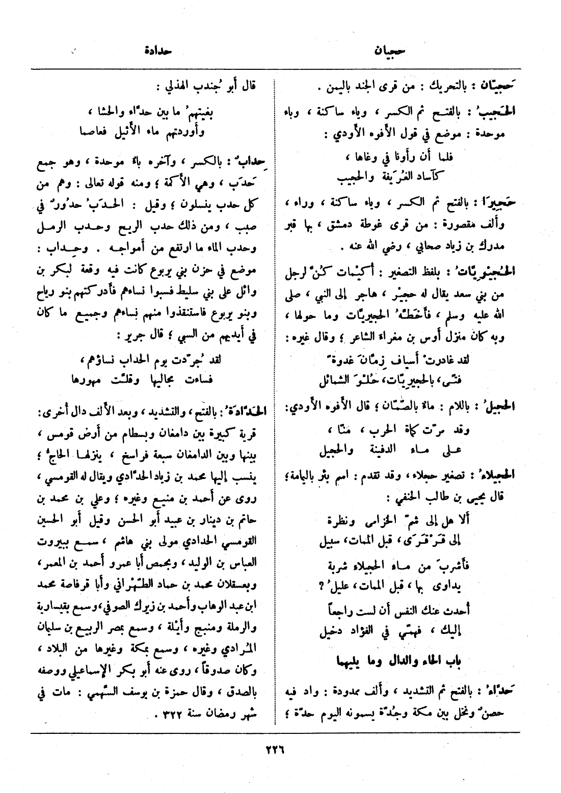 بالكسر، وآخره باء موحدة، وهو جمع حدب، وهي الأكمة، ومنه قوله تعالى: وَهُمْ من كُلِّ حَدَبٍ يَنْسِلُونَ 21: 96، وقيل: الحدب حدور في صبب، ومن ذلك حدب الريح وحدب الرمل وحدب الماء ما ارتفع من أمواجه. وحداب: