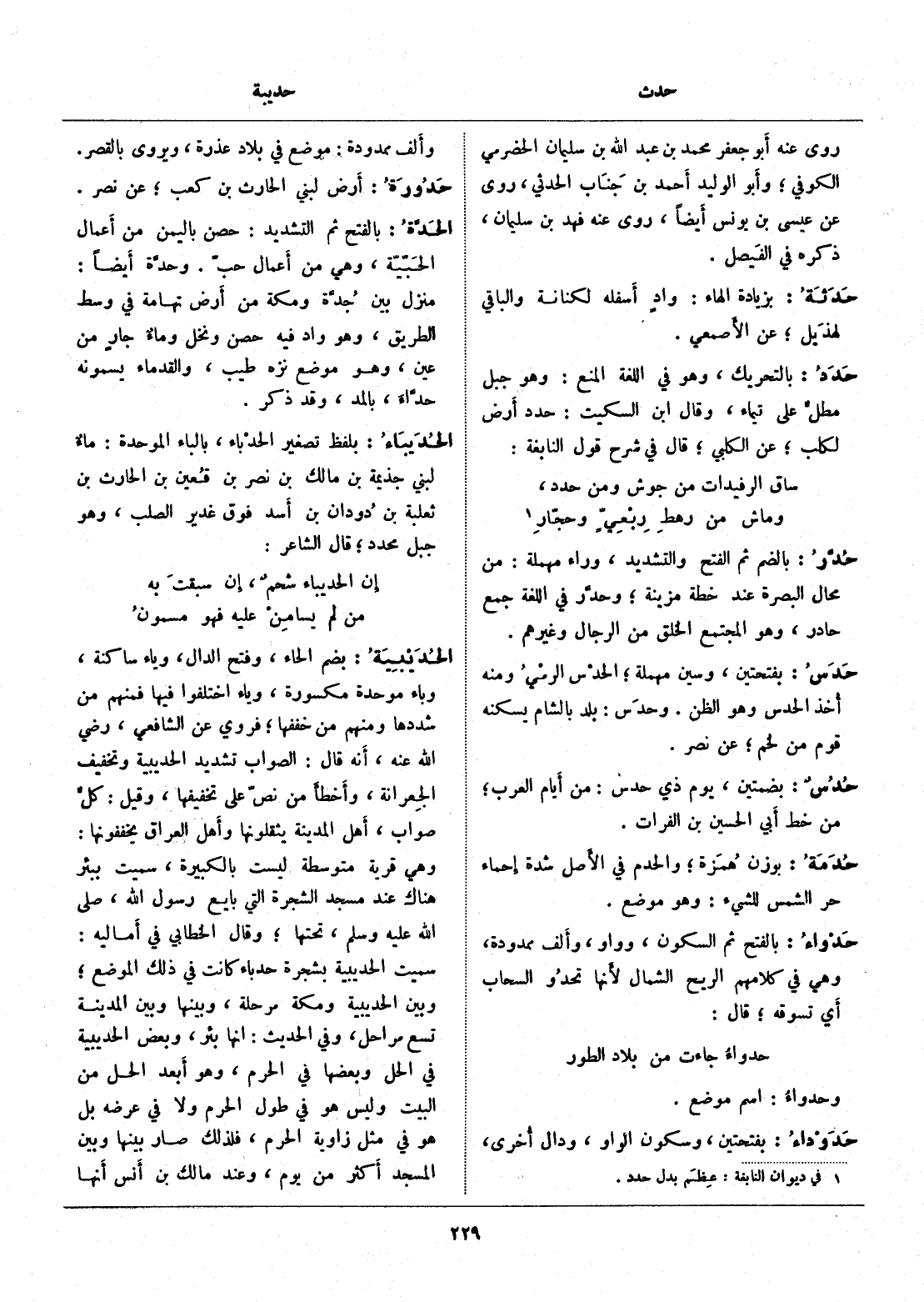 بضم الحاء، وفتح الدال، وياء ساكنة، وباء موحدة مكسورة، وياء اختلفوا فيها فمنهم من شددها ومنهم من خففها، فروي عن الشافعي، رضي الله عنه، أنه قال: الصواب تشديد الحديبية وتخفيف الجعرانة، وأخطأ من نصّ على تخفيفها، وقيل: كلّ صواب، أهل المدينة يثقلونها وأهل العراق يخففونها: