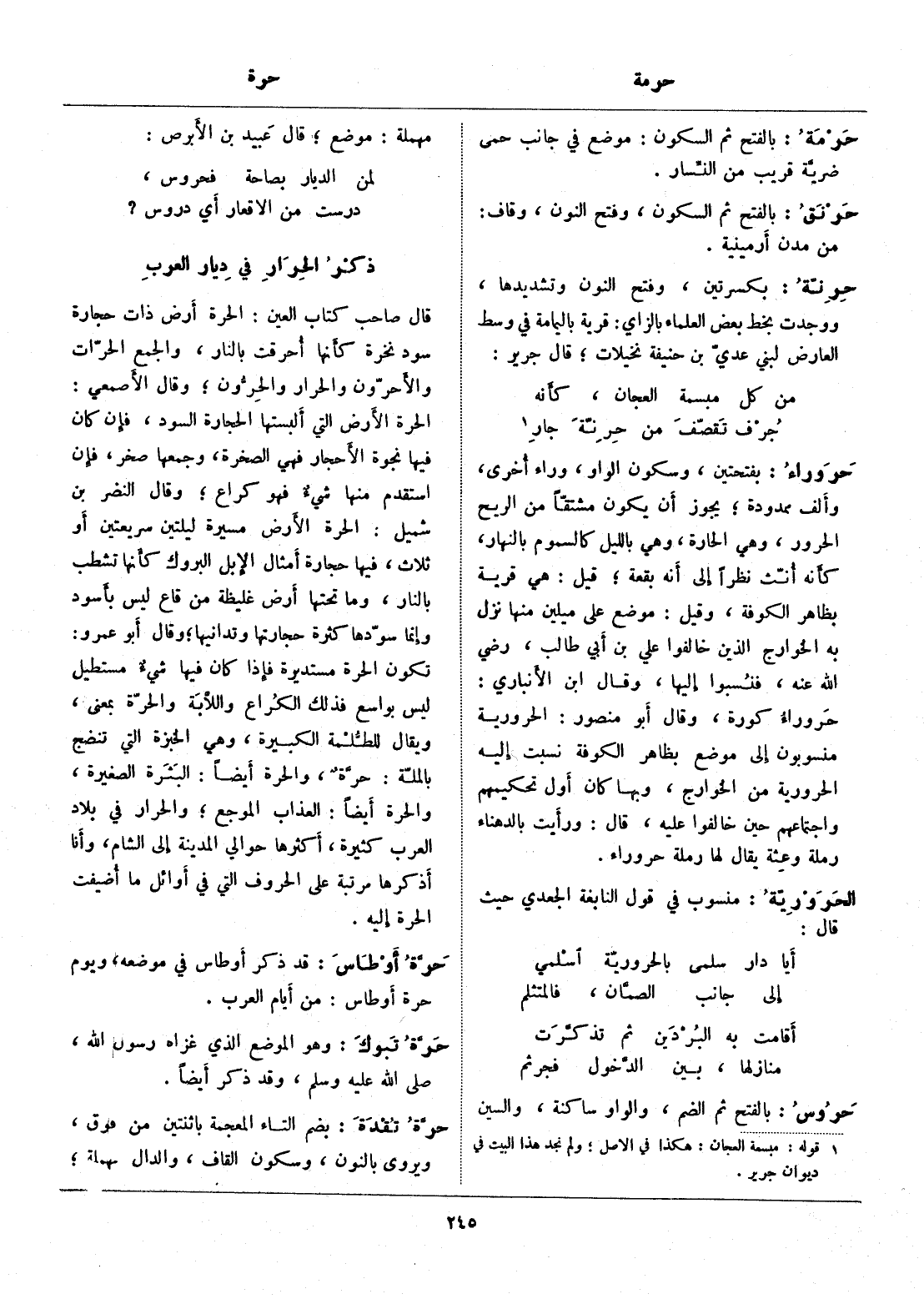 تكون الحرة مستديرة فإذا كان فيها شيء مستطيل ليس بواسع فذلك الكراع واللّابة والحرّة بمعنى، ويقال للطّلمة الكبيرة، وهي الخبزة التي تنضج بالملّة: حرّة، والحرة أيضا: البثرة الصغيرة، والحرة أيضا: العذاب الموجع، والحرار في بلاد العرب كثيرة، أكثرها حوالي المدينة إلى الشام، وأنا أذكرها مرتبة على الحروف التي في أوائل ما أضيفت الحرة إليه.
