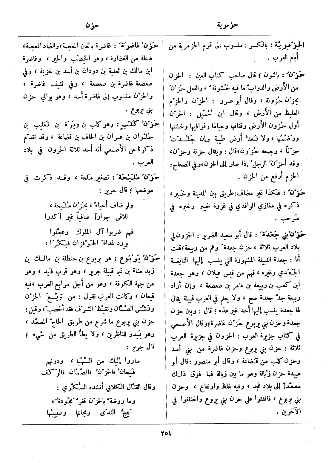 بالنون، قال صاحب كتاب العين: الحزن من الأرض والدوابّ ما فيه خشونة، والفعل حزن يحزن حزونة، وقال أبو عمرو: الحزن والحزم الغليظ من الأرض، وقال ابن شميل: الحزن أول حزون الأرض وقفافها وجبالها وقوافيها وخشنها ورضمها، ولا تعدّ أرض طيبة وإن جلدت حزنا، وجمعه حزون، قال: ويقال حزنة وحزن، وقد أحزن الرجل إذا صار إلى الحزن، وفي الصحاح: