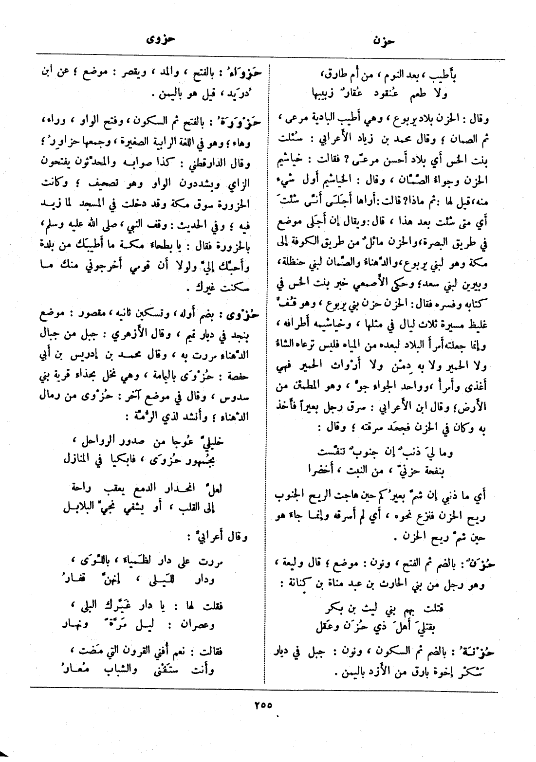 بضم أوله، وتسكين ثانيه، مقصور: موضع بنجد في ديار تميم، وقال الأزهري: جبل من جبال الدّهناء مررت به، وقال محمد بن إدريس بن أبي حفصة: حزوى باليمامة، وهي نخل بحذاء قرية بني سدوس، وقال في موضع آخر: حزوى من رمال الدّهناء، وأنشد لذي الرّمّة: