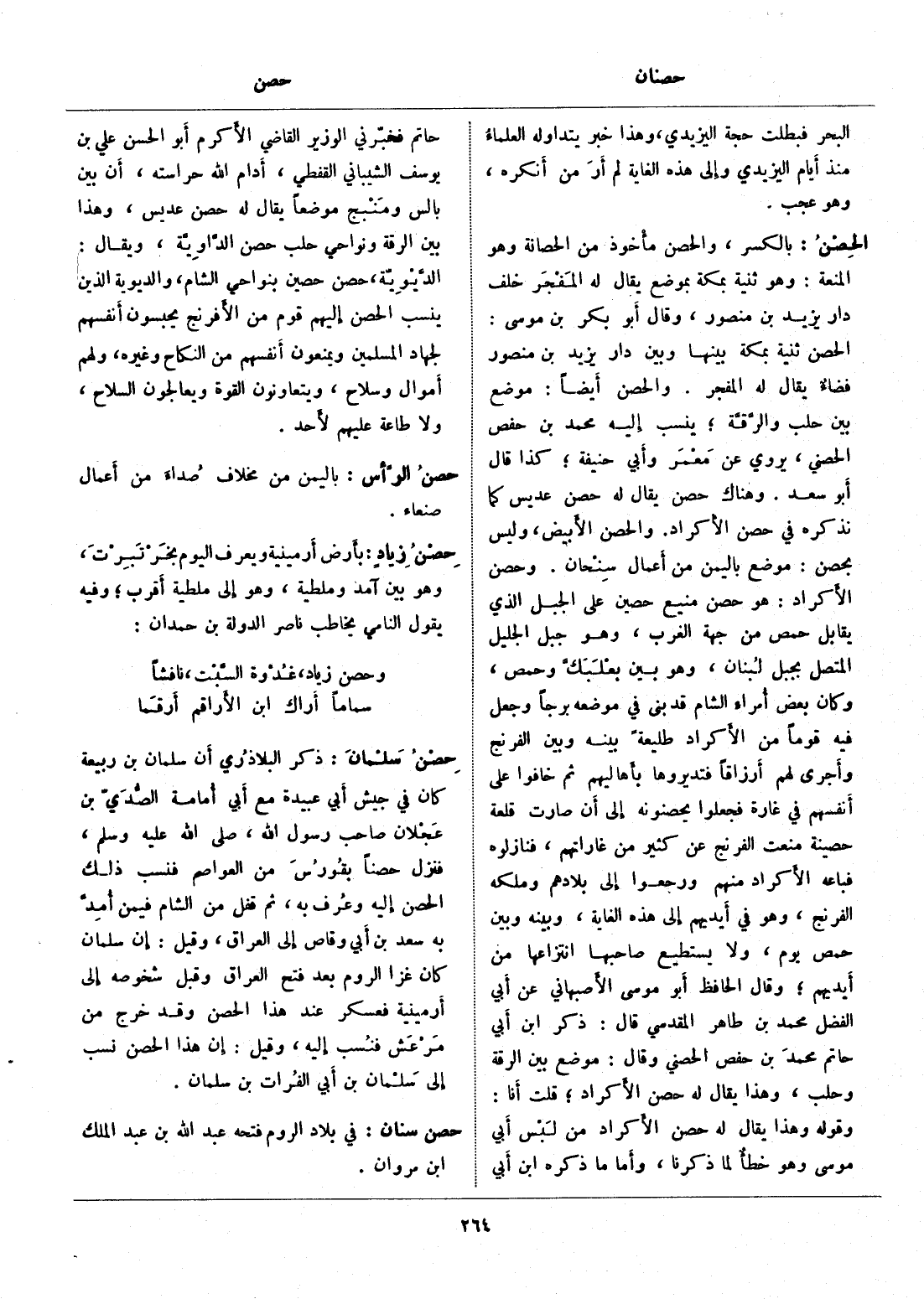 الحصن ثنية بمكة بينها وبين دار يزيد بن منصور فضاء يقال له المفجر. والحصن أيضا: موضع بين حلب والرّقّة، ينسب إليه محمد بن حفص الحصني، يروي عن معمر وأبي حنيفة، كذا قال أبو سعد. وهناك حصن يقال له حصن عديس كما تذكره في حصن الأكراد. والحصن الأبيض، وليس بحصن: موضع باليمن من أعمال سنحان. وحصن الأكراد: هو حصن منيع حصين على الجبل الذي يقابل حمص من جهة الغرب، وهو جبل الجليل المتصل بجبل لبنان، وهو بين بعلبك وحمص، وكان بعض أمراء الشام قد بنى في موضعه برجا وجعل فيه قوما من الأكراد طليعة بينه وبين الفرنج وأجرى لهم أرزاقا فتديروها بأهاليهم ثم خافوا على أنفسهم في غارة فجعلوا يحصنونه إلى أن صارت قلعة حصينة منعت الفرنج عن كثير من غاراتهم، فنازلوه فباعه الأكراد منهم ورجعوا إلى بلادهم وملكه الفرنج، وهو في أيديهم إلى هذه الغاية، وبينه وبين حمص يوم، ولا يستطيع صاحبها انتزاعها من أيديهم، وقال الحافظ أبو موسى الأصبهاني عن أبي الفضل محمد بن طاهر المقدسي قال: ذكر ابن أبي حاتم محمد بن حفص الحصني وقال: موضع بين الرقة وحلب، وهذا يقال له حصن الأكراد، قلت أنا: