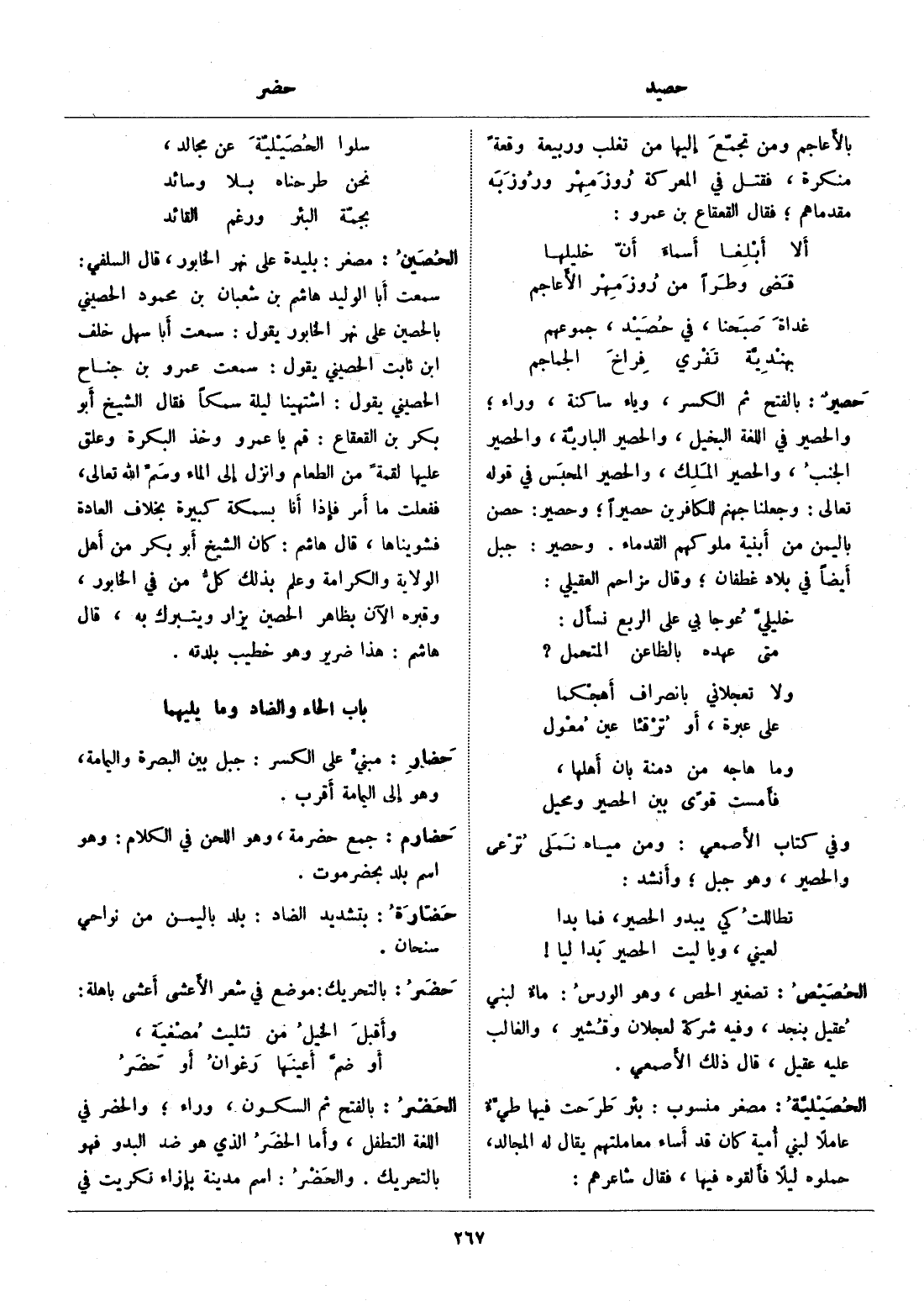 بالفتح ثم الكسر، وياء ساكنة، وراء، والحصير في اللغة البخيل، والحصير الباريّة، والحصير الجنب، والحصير الملك، والحصير المحبس في قوله تعالى: وَجَعَلْنا جَهَنَّمَ لِلْكافِرِينَ حَصِيراً 17: 8، وحصير: حصن باليمن من أبنية ملوكهم القدماء. وحصير: جبل أيضا في بلاد غطفان، وقال مزاحم العقيلي: