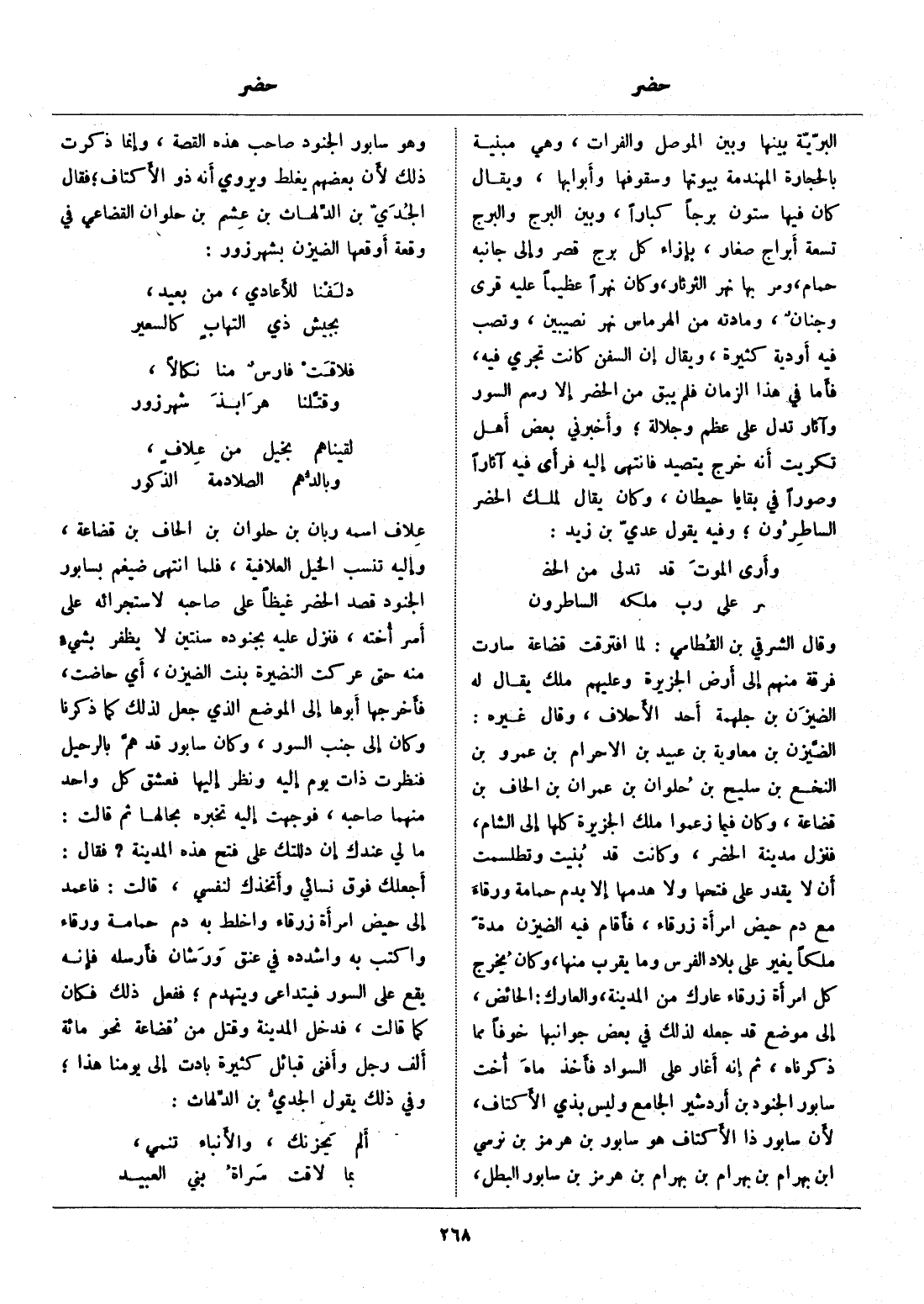 الضّيزن بن معاوية بن عبيد بن الاحرام بن عمرو بن النخع بن سليح بن حلوان بن عمران بن الحاف بن قضاعة، وكان فيما زعموا ملك الجزيرة كلها إلى الشام، فنزل مدينة الحضر، وكانت قد بنيت وتطلسمت أن لا يقدر على فتحها ولا هدمها إلا بدم حمامة ورقاء مع دم حيض امرأة زرقاء، فأقام فيه الضيزن مدة ملكا يغير على بلاد الفرس وما يقرب منها، وكان يخرج كل امرأة زرقاء عارك من المدينة، والعارك: الحائض، إلى موضع قد جعله لذلك في بعض جوانبها خوفا مما ذكرناه، ثم إنه أغار على السواد فأخذ ماه أخت سابور الجنود بن أردشير الجامع وليس بذي الأكتاف، لأن سابور ذا الأكتاف هو سابور بن هرمز بن نرسي ابن بهرام بن بهرام بن بهرام بن هرمز بن سابور البطل، وهو سابور الجنود صاحب هذه القصة، وإنما ذكرت ذلك لأن بعضهم يغلط ويروي أنه ذو الأكتاف، فقال الجديّ بن الدّلهاث بن عشم بن حلوان القضاعي في وقعة أوقعها الضيزن بشهرزور: