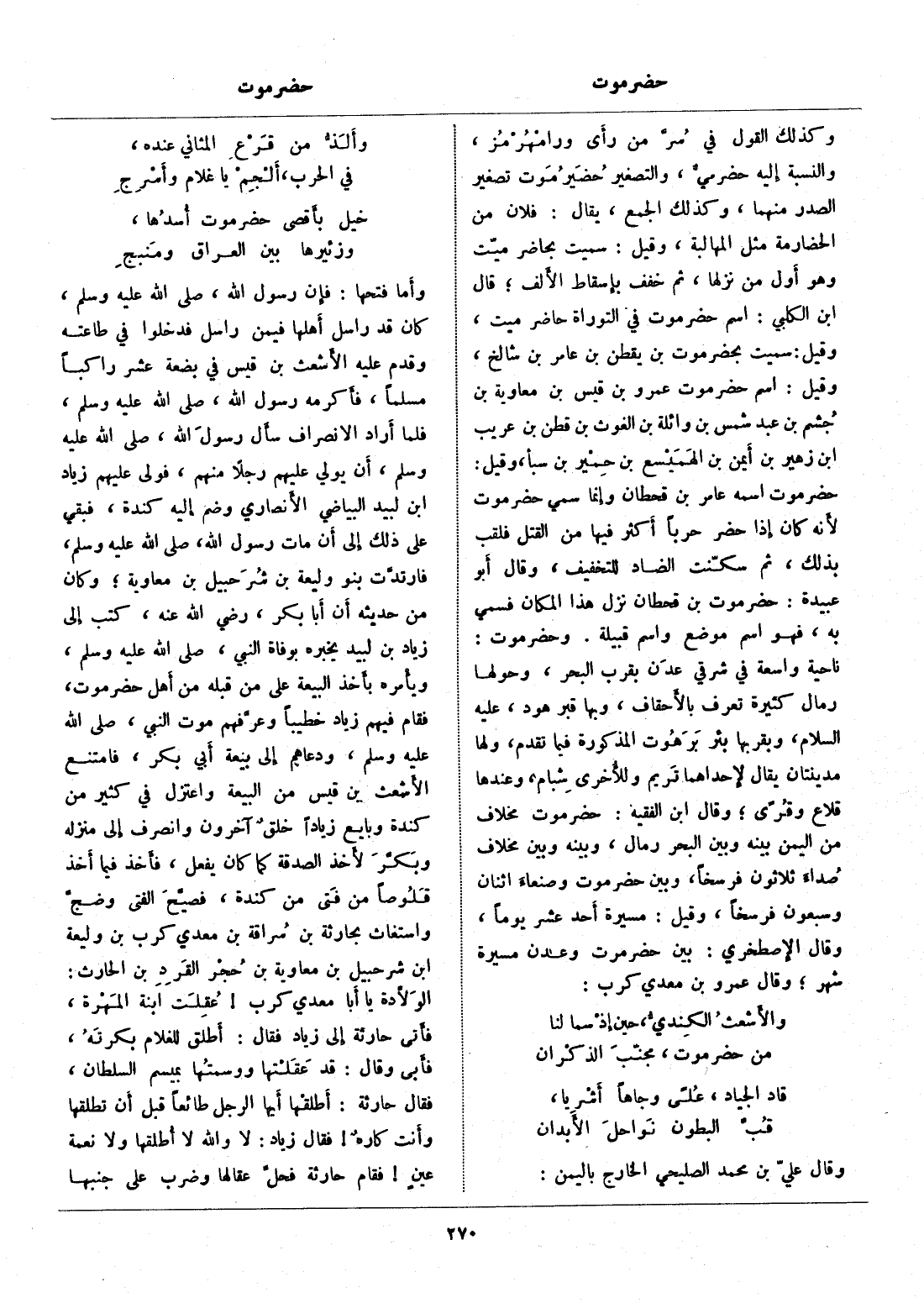 وكذلك القول في سرّ من رأى ورامهرمز، والنسبة إليه حضرميّ، والتصغير حضيرموت تصغير الصدر منهما، وكذلك الجمع، يقال: فلان من الحضارمة مثل المهالبة، وقيل: سميت بحاضر ميّت وهو أول من نزلها، ثم خفف بإسقاط الألف، قال ابن الكلبي: اسم حضرموت في التوراة حاضر ميت، وقيل: سميت بحضرموت بن يقطن بن عامر بن شالخ، وقيل: اسم حضرموت عمرو بن قيس بن معاوية بن جشم بن عبد شمس بن وائلة بن الغوث بن قطن بن عريب ابن زهير بن أيمن بن الهميسع بن حمير بن سبأ، وقيل: